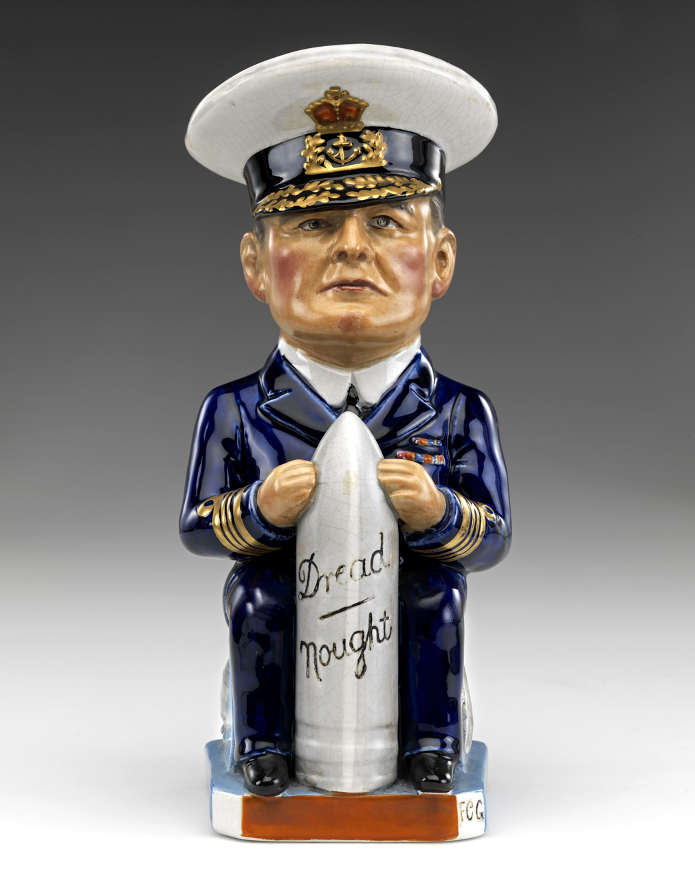 . Toby jug modelled as a seated figure of Admiral David, Earl Beatty (1871-1936). Depicted in uniform and wearing a cap; he holds a shell inscribed 'Dreadnought' between his knees.