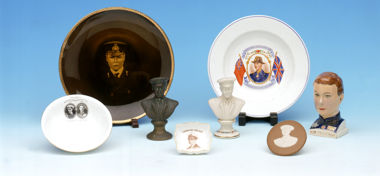 . An earthenware bust of Edward VIII (1894-1972) in military uniform and medals, glazed and painted. 'H.M. KING EDWARD VIII', incised on the front. The maker's name is stamped on the base.