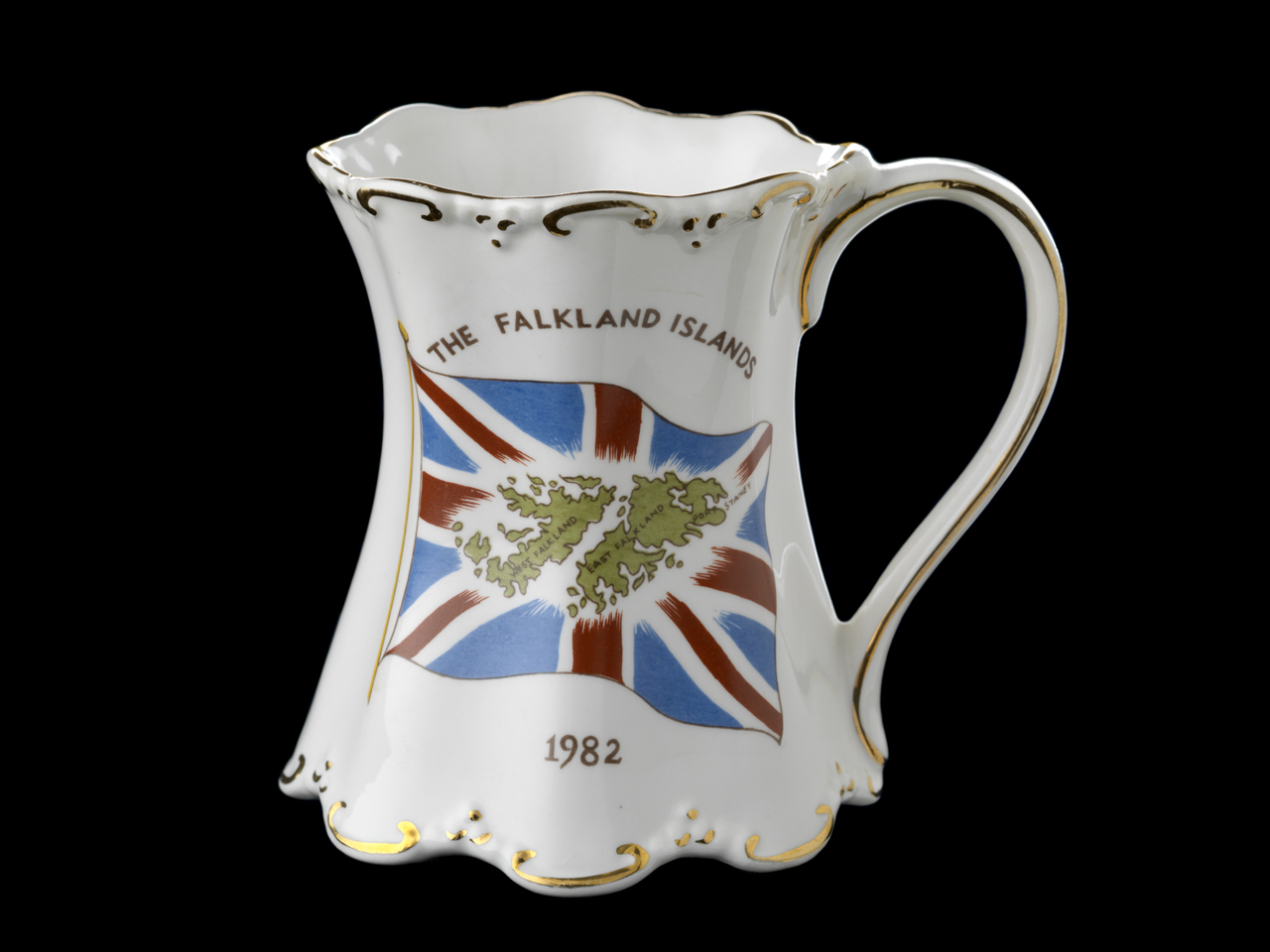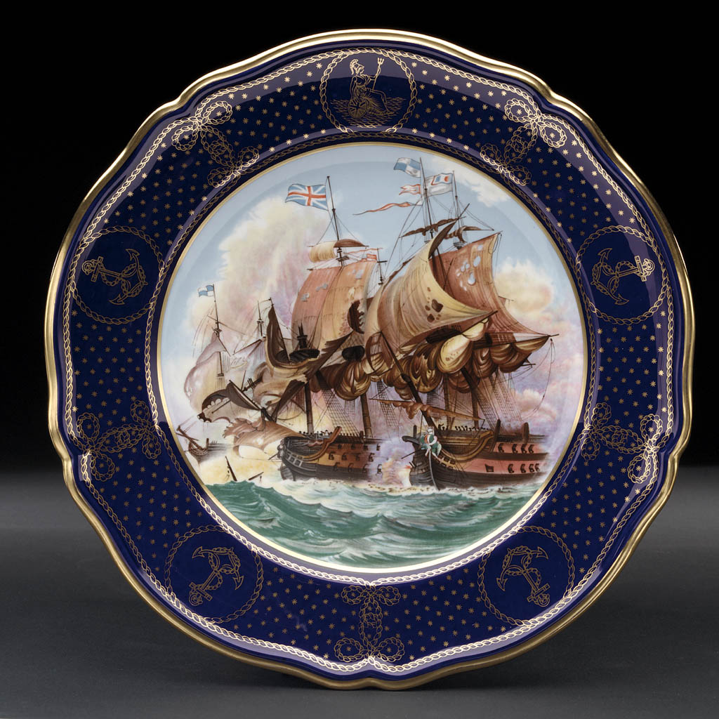 . Bone china plate printed with a full-colour illustration after P. J. de Loutherbourg showing Lord Howe's flagship 'Queen Charlotte' engaging the French 'Montagne'. The cobalt blue border is decorated with gold stars and a formal
