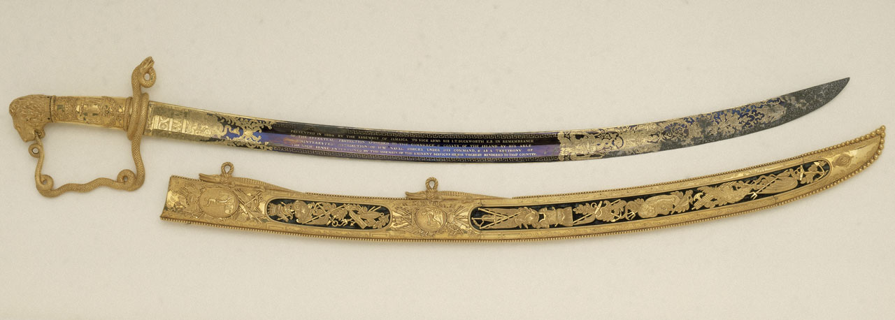 . Presentation sword, which belonged to Admiral Sir John Thomas Duckworth (1748-1817). The hilt of the sword consists of a knuckle-bow guard, box-shaped pommel and langets. The guard is engraved with foliage. The top of the pommel is engraved with a sword