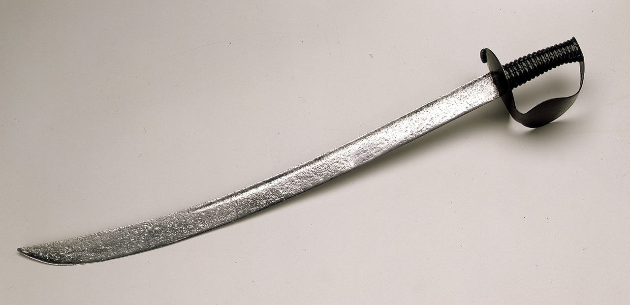 . Cutlass, the hilt of the cutlass consists of either a steel or an iron guard which has been painted black, made in the form of a double-disc. The tongue at the back of the guard is rolled up and has a slot for a knot near the pommel. The cutlass has an