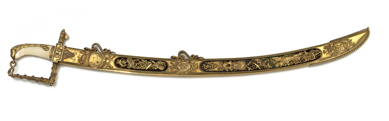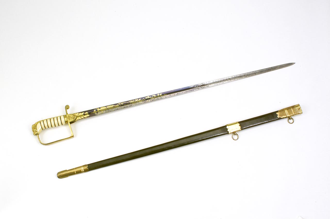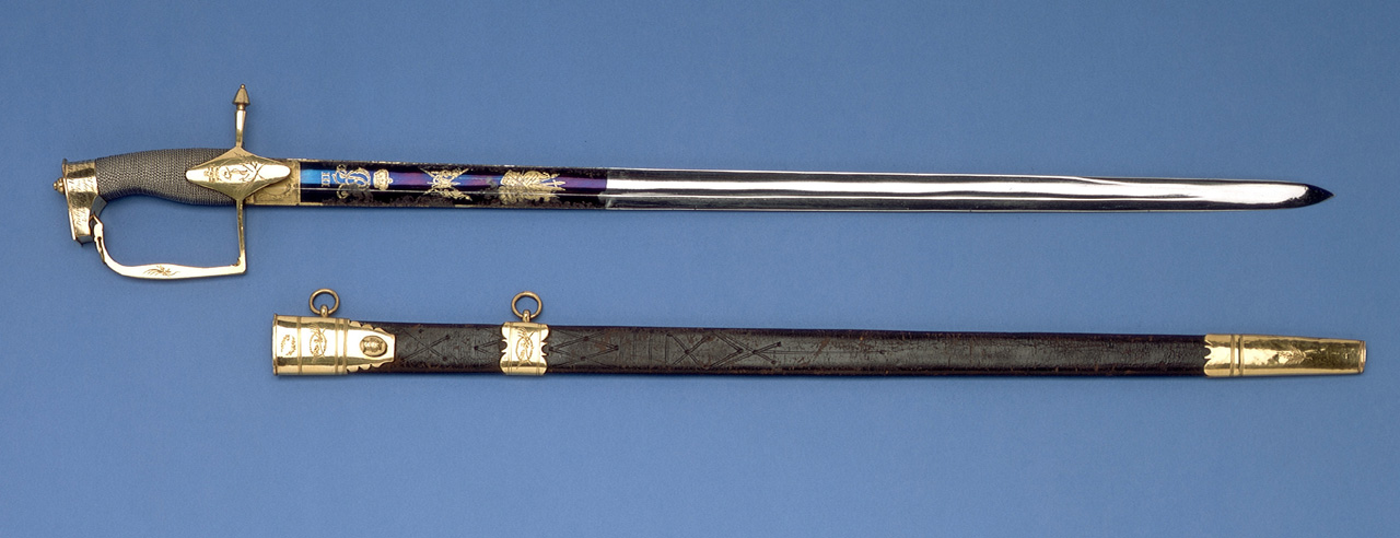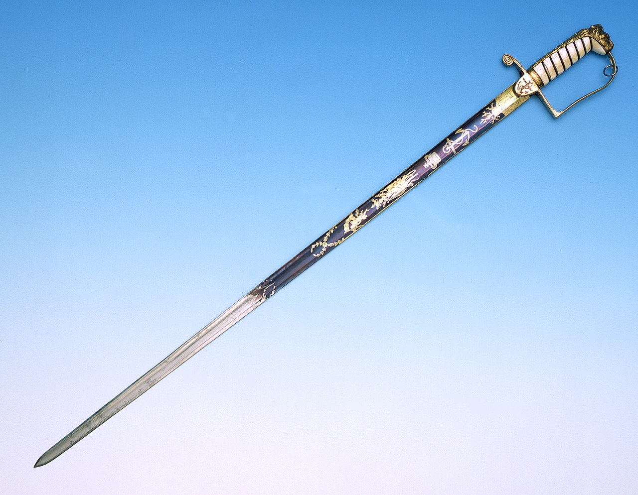 . Triple bar-hilted sword. The hilt consists of a gilt triple knuckle guard which closes when not in use, and is engraved with a leaf pattern and trophies of war. The shell guard contains a foul anchor. It has an ivory pommel. The blade is steel and strai