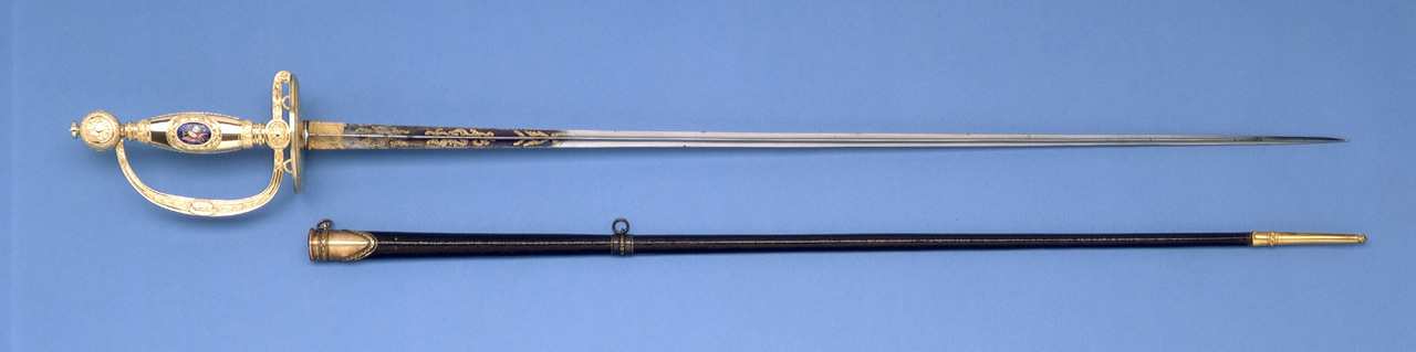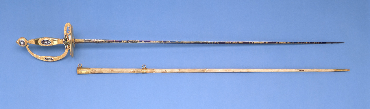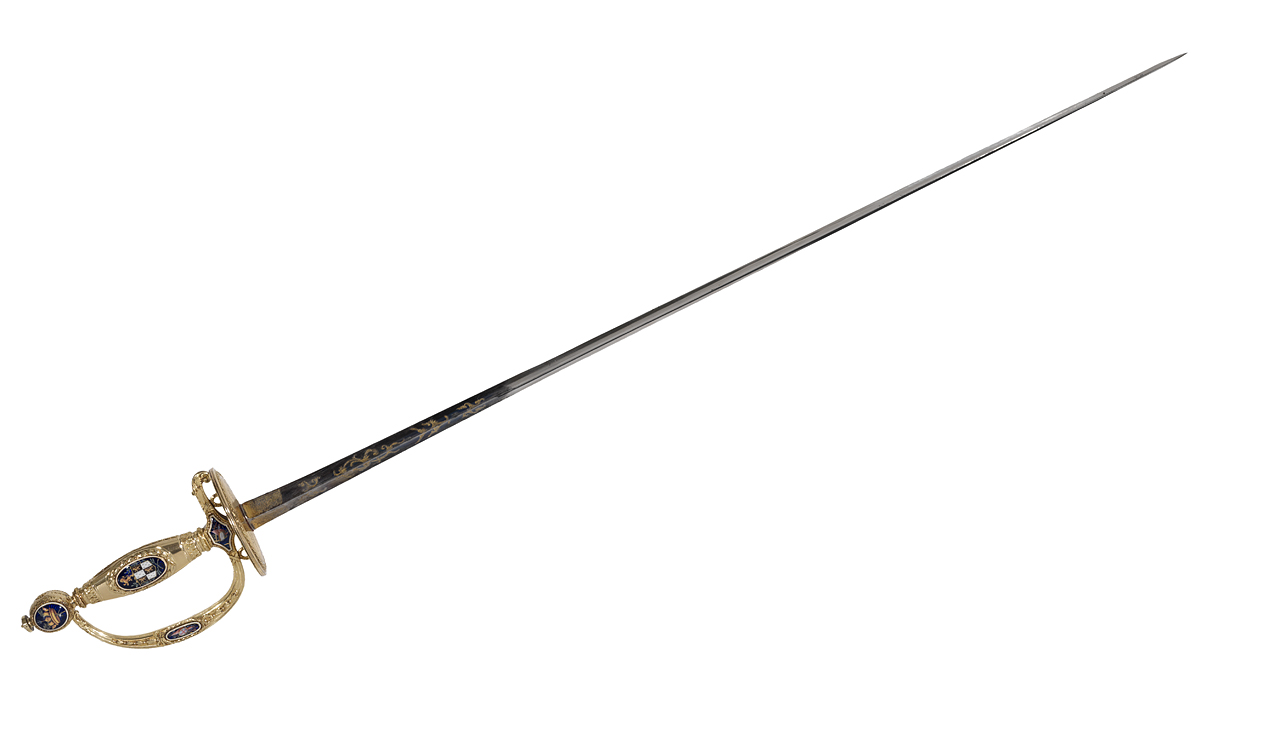 . Presentation small-sword which belonged to Rear-Admiral John Macbride (d.1800). The enamelled gold hilt is apparently unmarked. The knuckle-bow guard with ring inset is decorated in the same manner as the urn-shaped pommel. There are upturned quillons a
