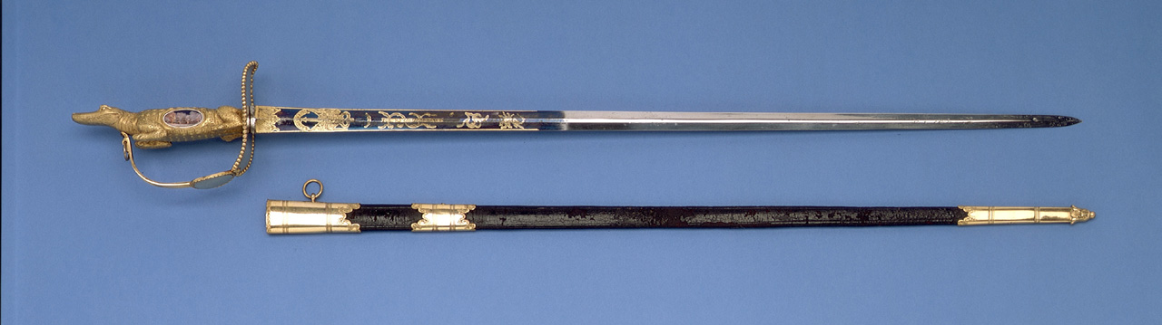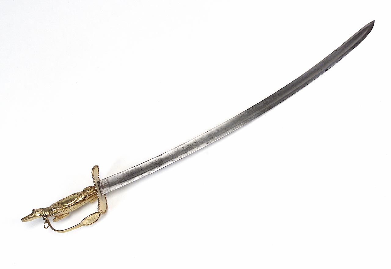 . Presentation Sword. Owned by Vice-Admiral Sir Samuel Hood (1762-1814). Hilt consists of gilt metal. The grip is cast and chased in the form of a crocodile and bears on both sides engraved plaques. The knuckle-bow form of guard broadens to incorporate an