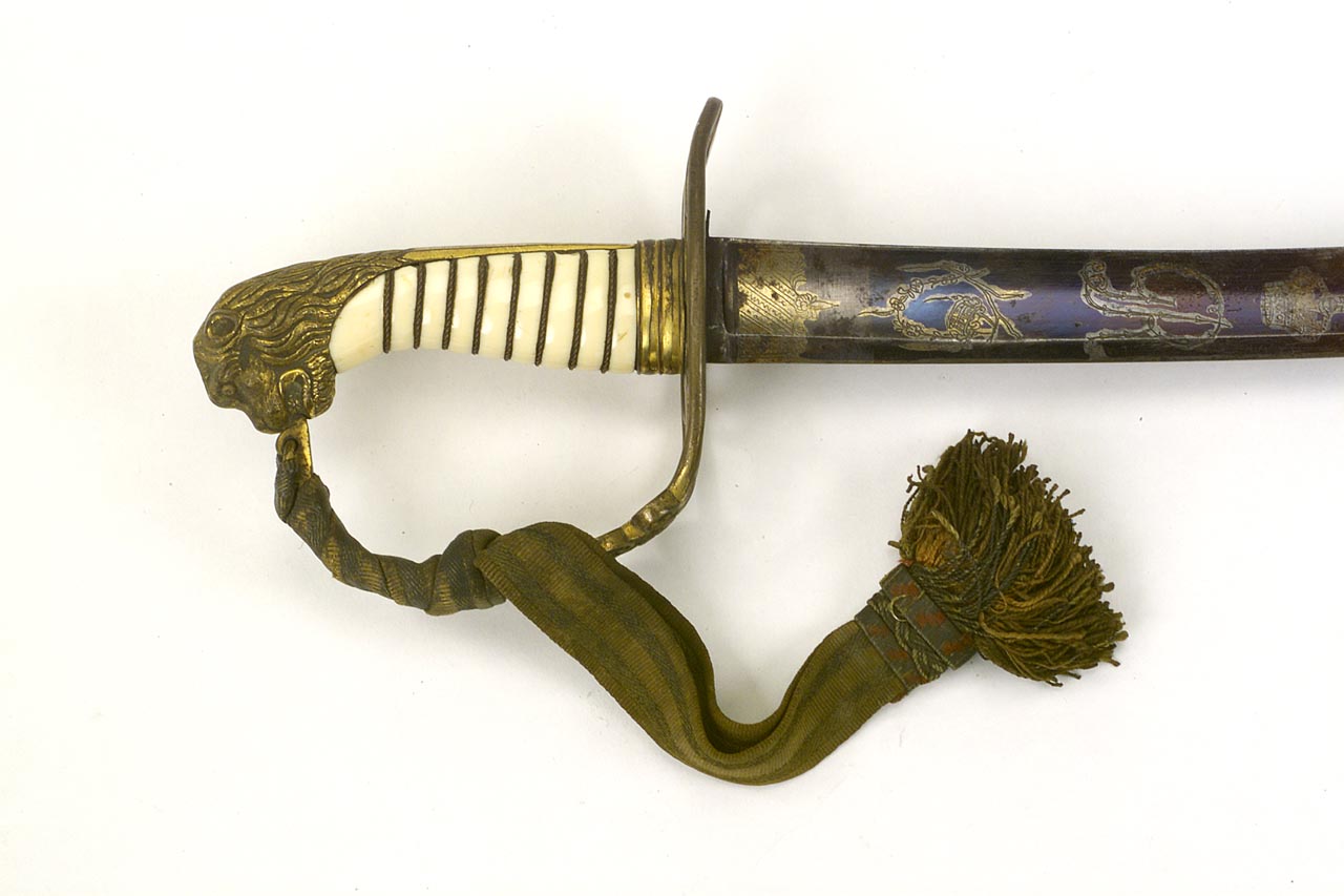 . Presentation sword. The hilt consists of a gilt stirrup guard, a lion's-head pommel and back-piece, the mane extending the length of the back-piece and a white polished ivory grip bound with three gilt wires. The langets have broken off. The straig