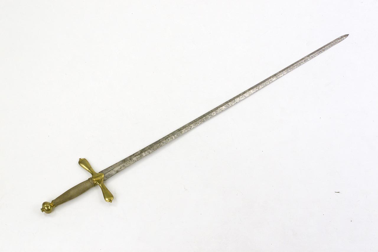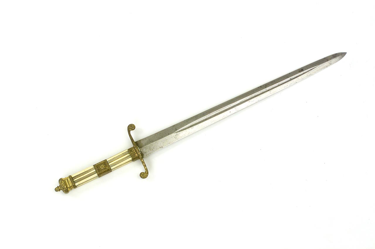 . Cross-hilted sword, the hilt of the sword consists of a cross hilt with inversed ends. The sword has a fluted white ivory grip with a four-sided gilt pommel. The straight, double-edged steel blade has a central fuller running to the spear point. The bla