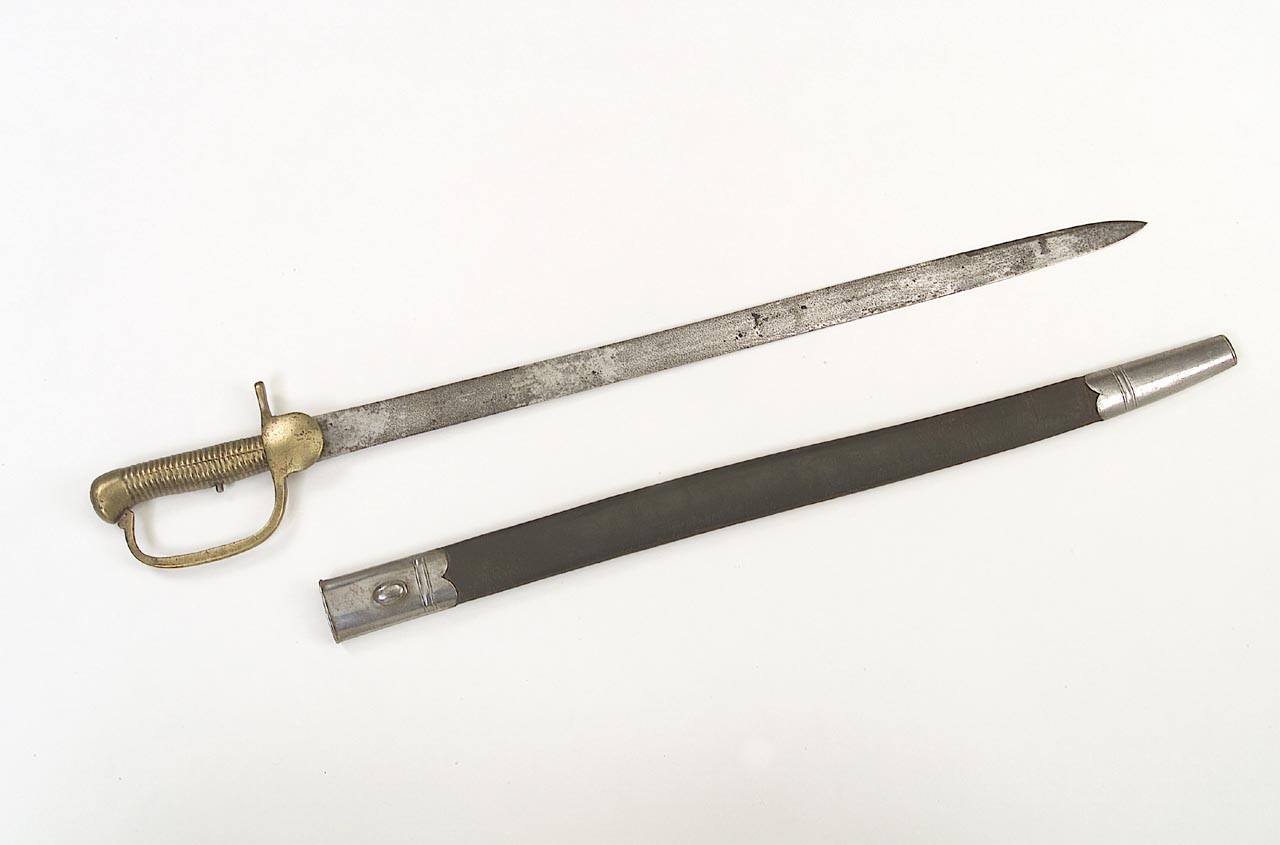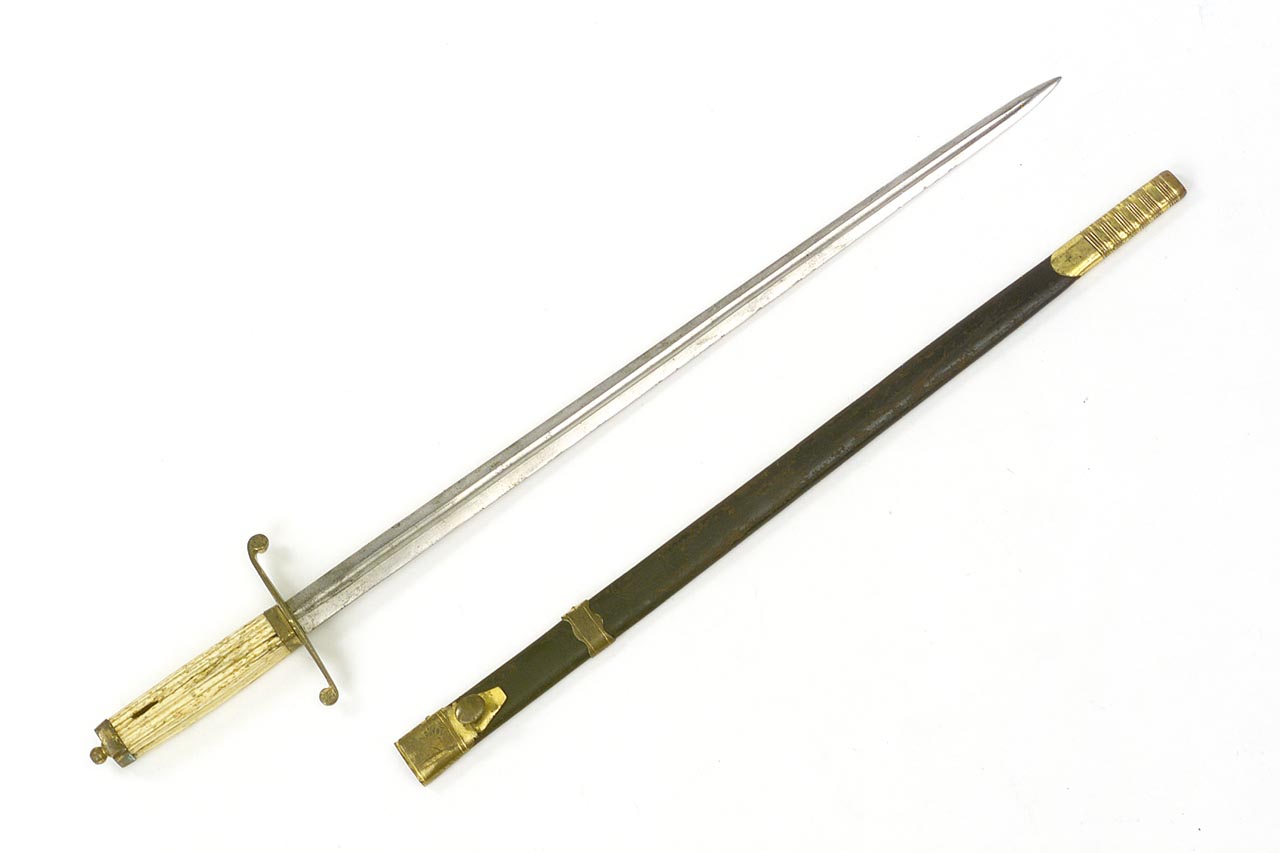 . Bayonet. The hilt consists of a brass knuckle-bow, hooked into the pommel, an obverse langet and a short straight quillon. The grip is moulded brass, with horizontal grooves and pommel cast in one piece, the tang and appearing at the base. A steel sprin