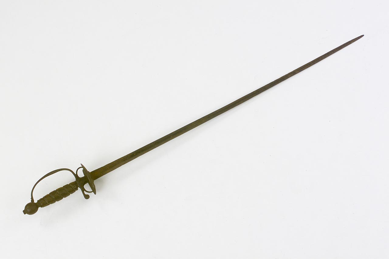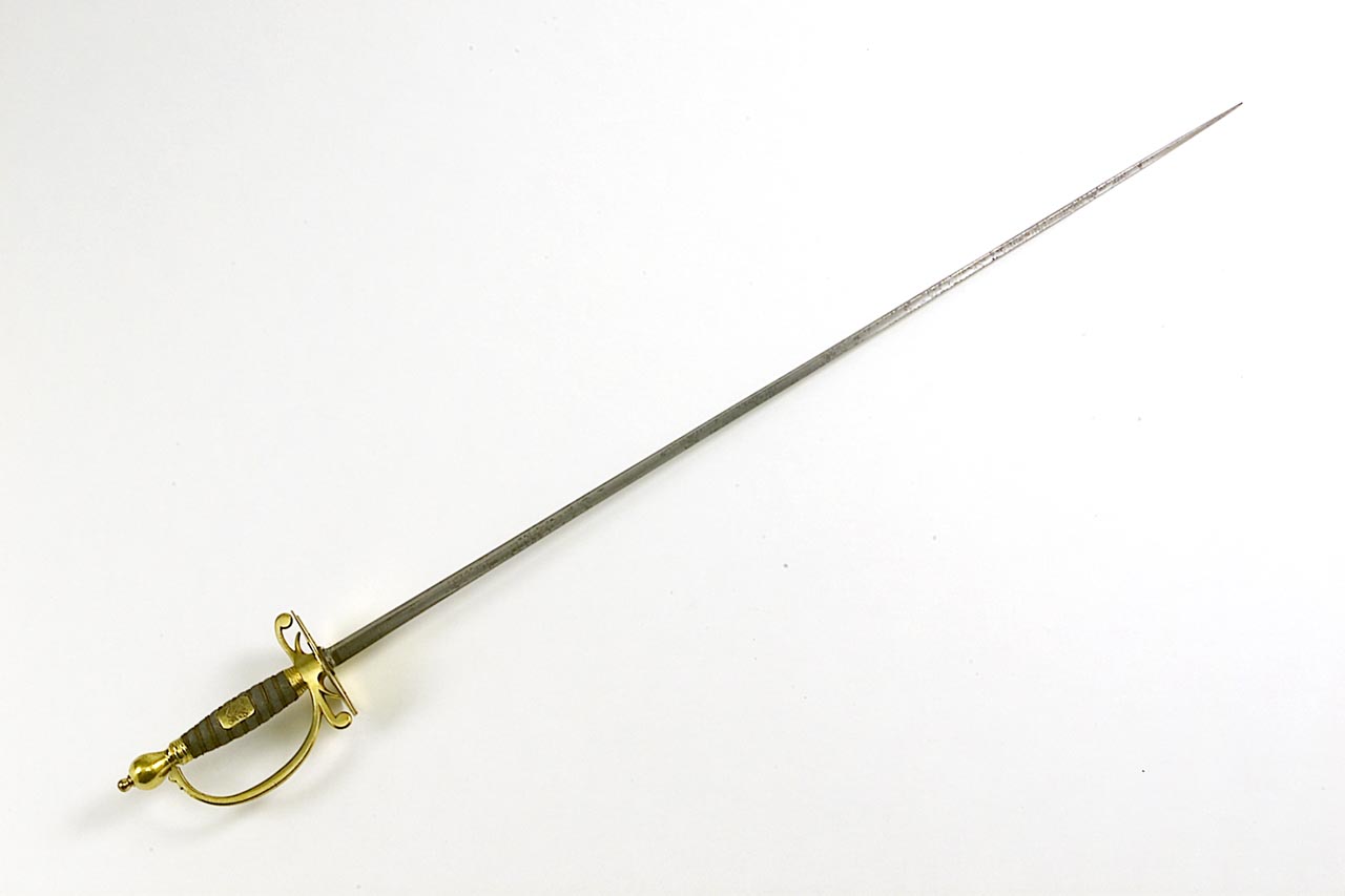 . Small-sword, thought to have belonged to Rear-Admiral Robert Keeler (active 1756-1790). The hilt of the small-sword consists of an olive-shaped steel pommel, pas d'ane rings, two shells and a plain knuckle-guard. The straight, double-edged steel bl