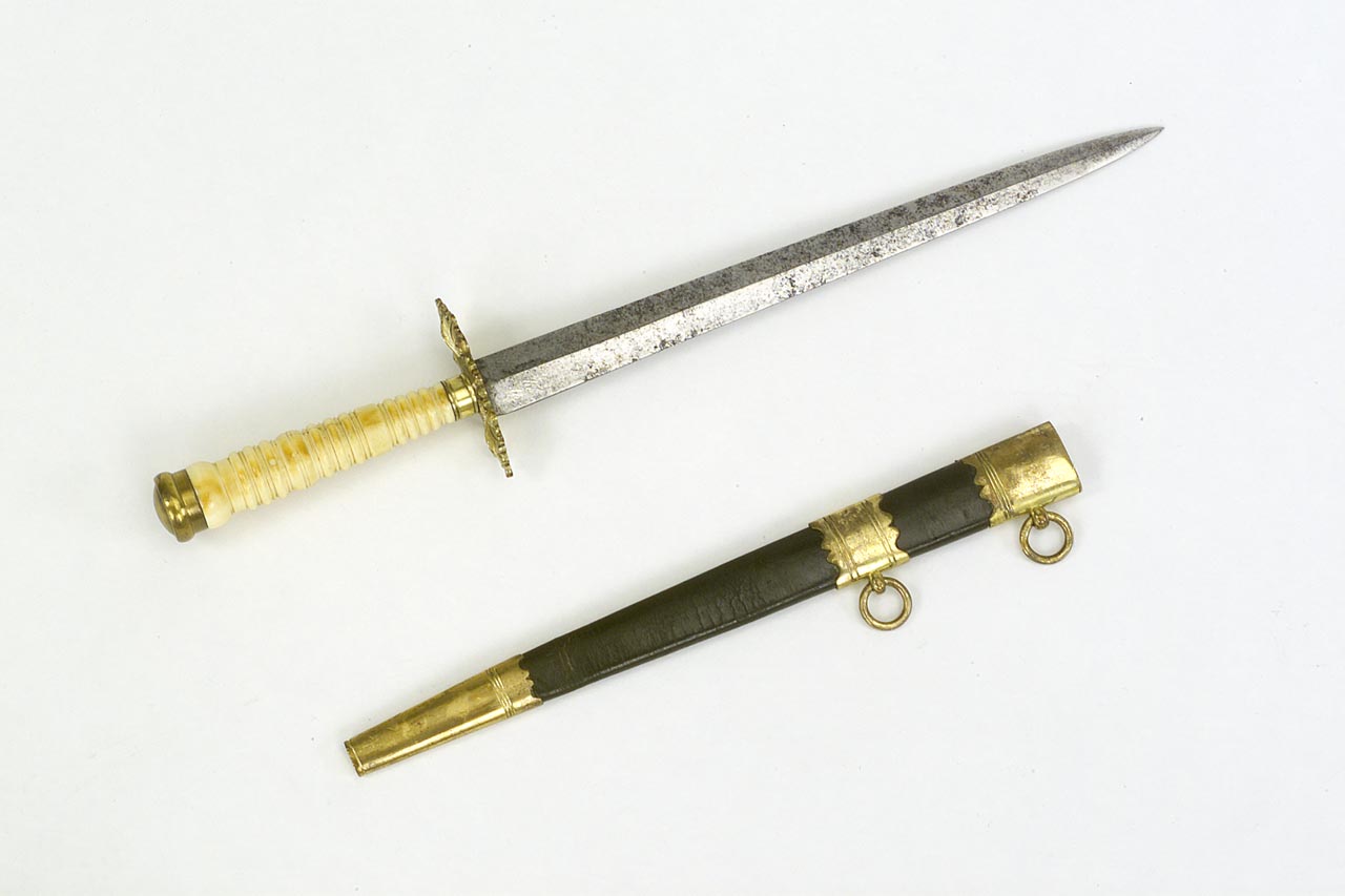 Straight-bladed dirk. Straight-bladed dirk, the hilt of the dirk consists of an eight-sided piece of ivory, with a gilt crosspiece with inversed ends. The eight-sided pommel has a prominent tang button. The pommel is engraved on three sides with the words