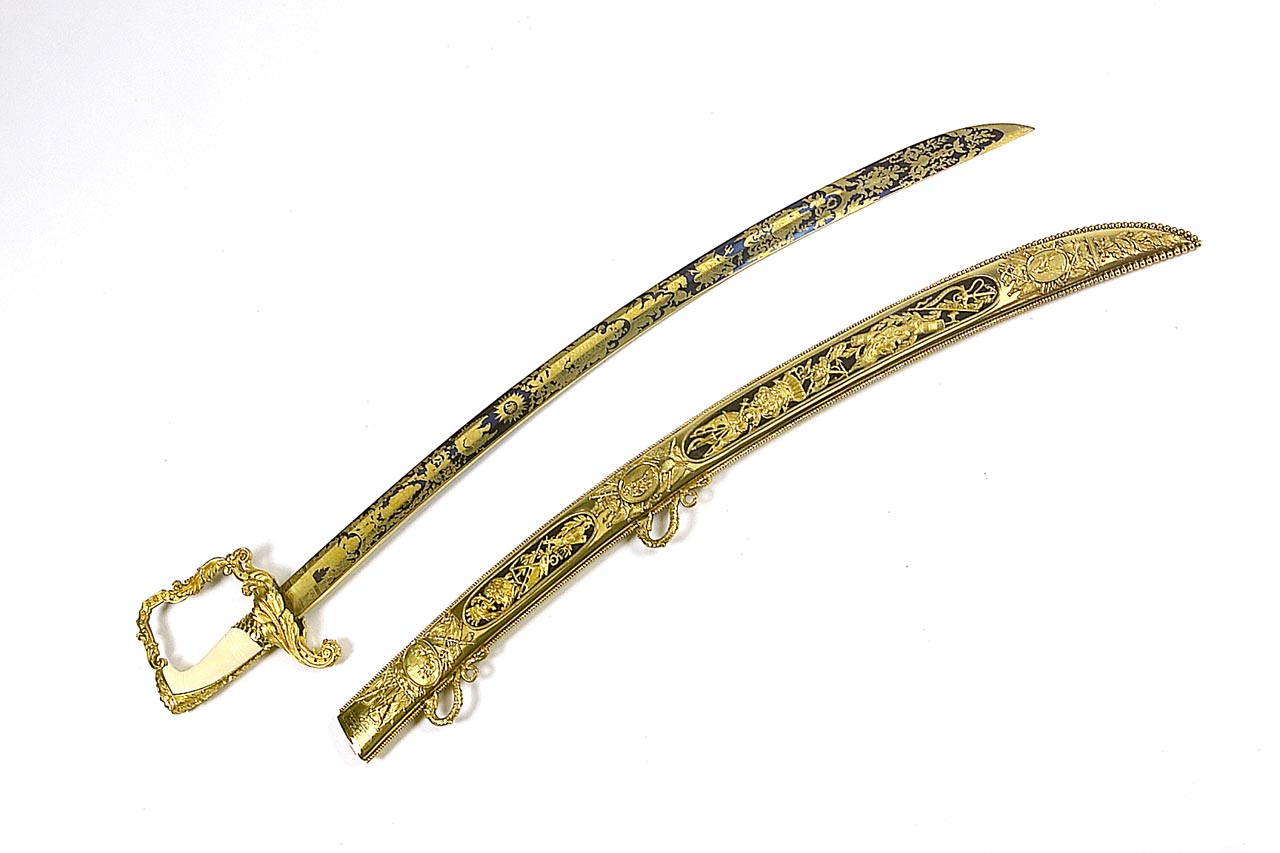 . The scabbard is WPN1623.1. Presentation sword which belonged to Lieutenant William Duffy. Copper gilt hilt decorated with leaves and scales. Lion's head mask pommel and langets engraved with head of George III. Curved blade with blued and gilt deco