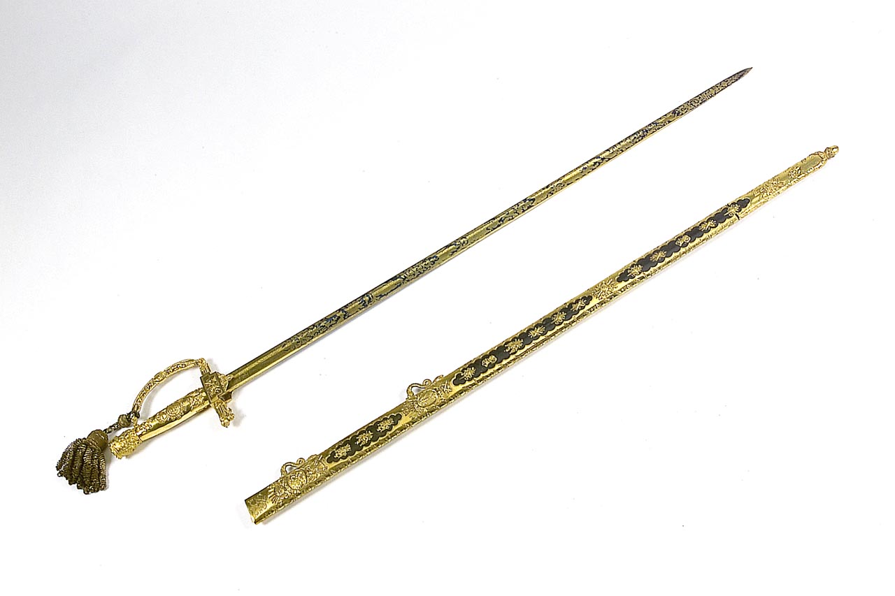 . Small-sword of Civil Branch, Royal Navy (Purser). The gilt small-sword-type hilt has an olive pommel, rudimenatry pas d'ane and flat, plain shell with the reverse half-hinged. The black fish-skin grip is bound with three gilt wires and on the obver