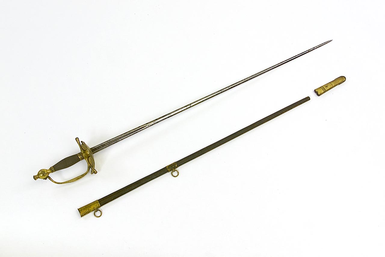 . Small-sword of Civil Branch of Royal Navy (Secretary). The gilt small-sword hilt has an olive pommel, pronounced tang button, rudimentary pas d'ane, and the obverse of a shell hinged downwards. The brown horn grip is bound with three copper wires,