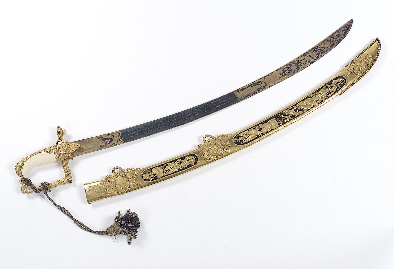 . Presentation sword, which is supposedly a replica of the sword presented to Vice-Admiral Horatio Nelson (1758-1805) by the Sultan of Turkey after the Battle of the Nile in 1798. The hilt of the sword consists of a gilt crocodile, which forms the pommel