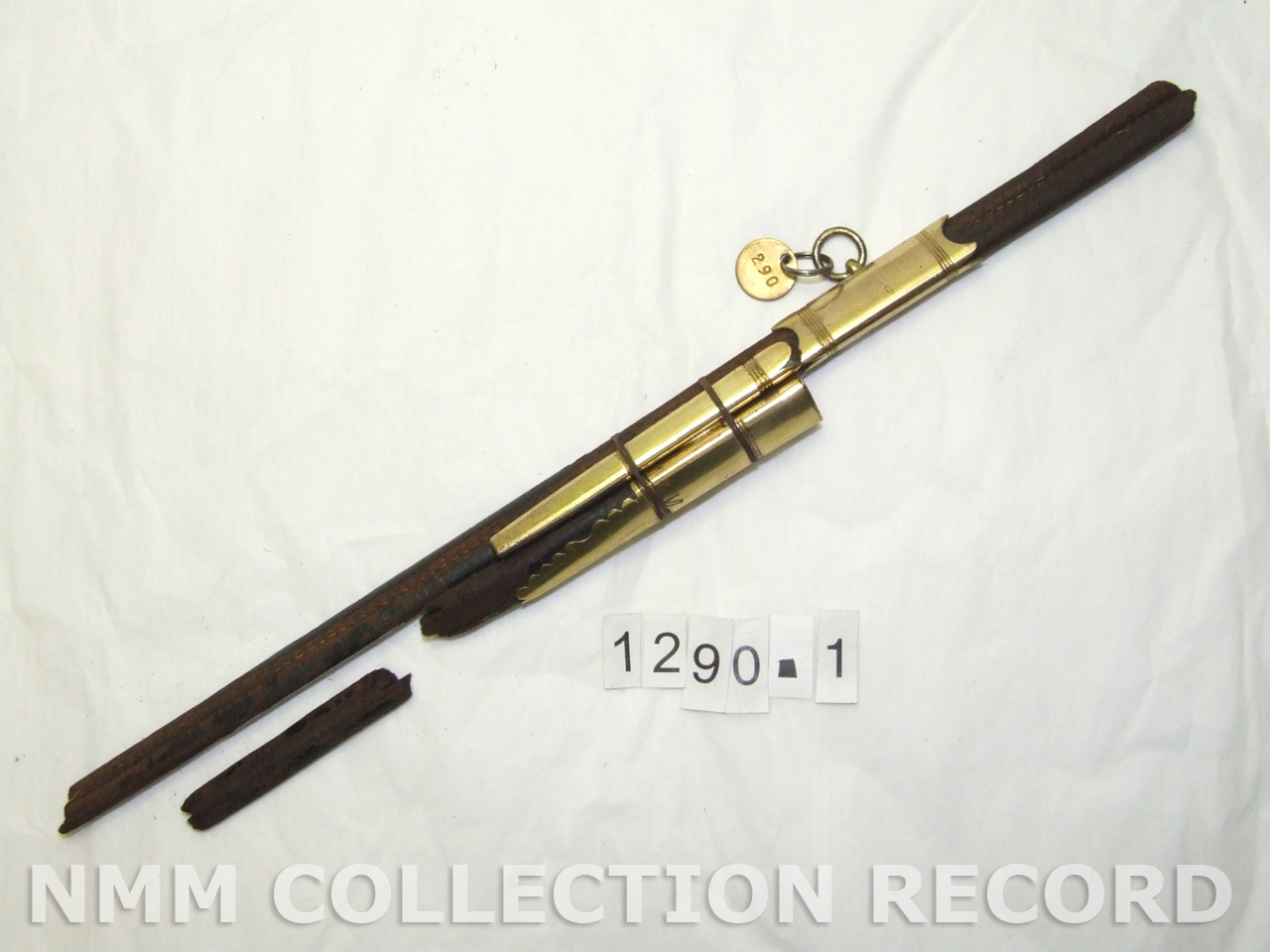 Presentation Sword. Scabbard for presentation Sword. Owned by Captain Sir Thomas Staines 1776-1830. The wooden scabbard is covered in black leather and the whole incased in brass so that only three panels of leather appear. The supporting rings have been