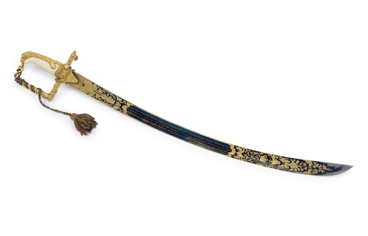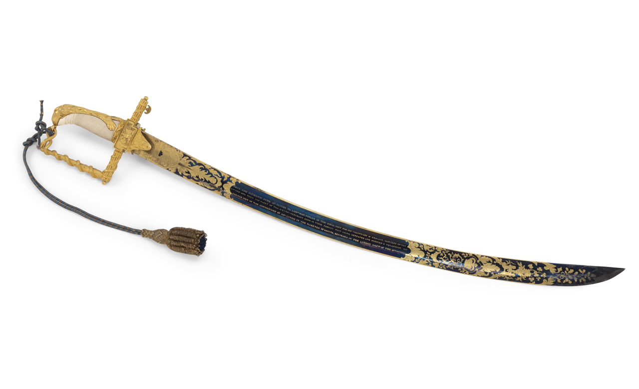 . Lloyds Patriotic Fund £100 presentation sword, which belonged to Vice-Admiral Sir Henry Blackwood (1770-1832). The hilt of the sword consists of a gilt quillon, which is shaped like a Roman fascis, the guard meeting this at right angles and made i