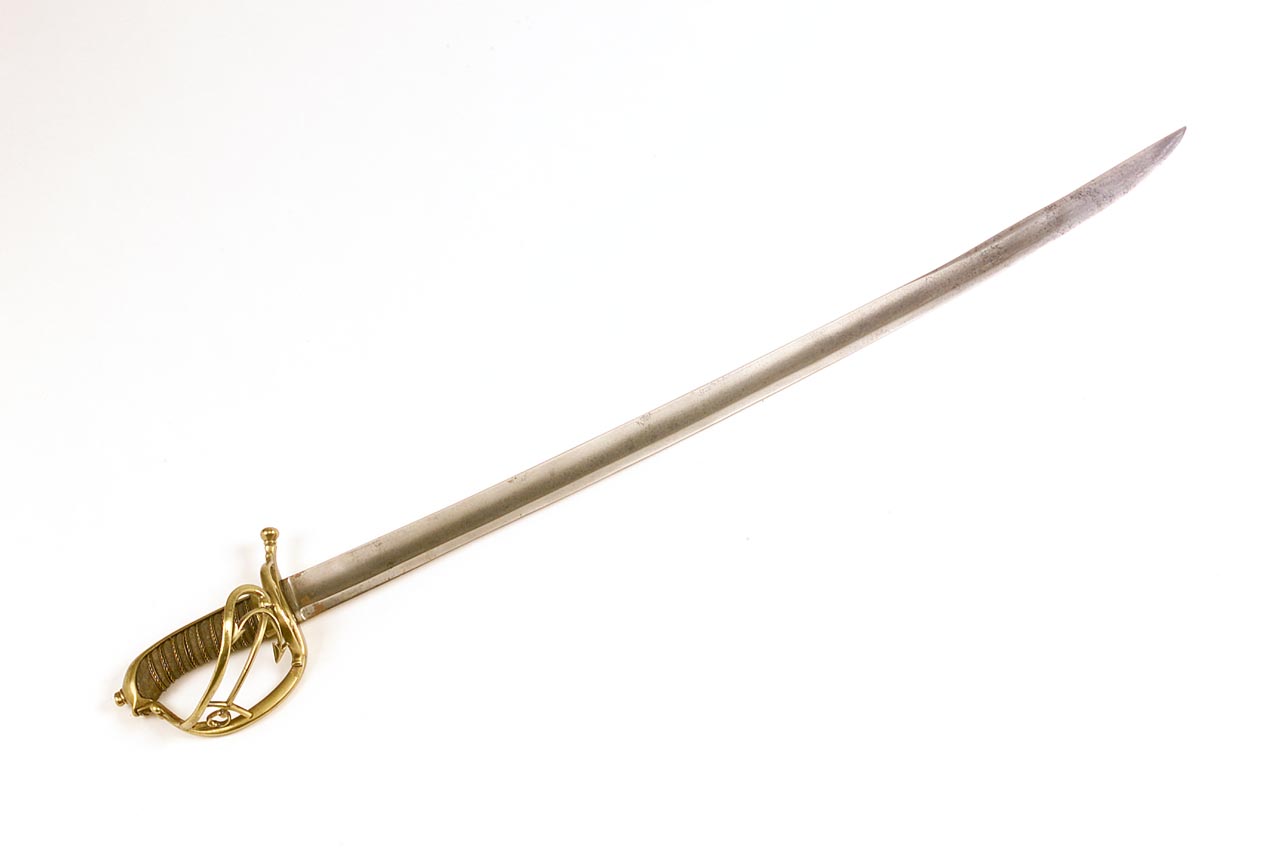 . Presentation sword, which belonged to Captain James Analby Legard (died 1869). The hilt of the sword consists of an ornate gilt square guard. The knuckle-guard is shaped like a club with a serpent twisted around it, the serpent's head passing throu