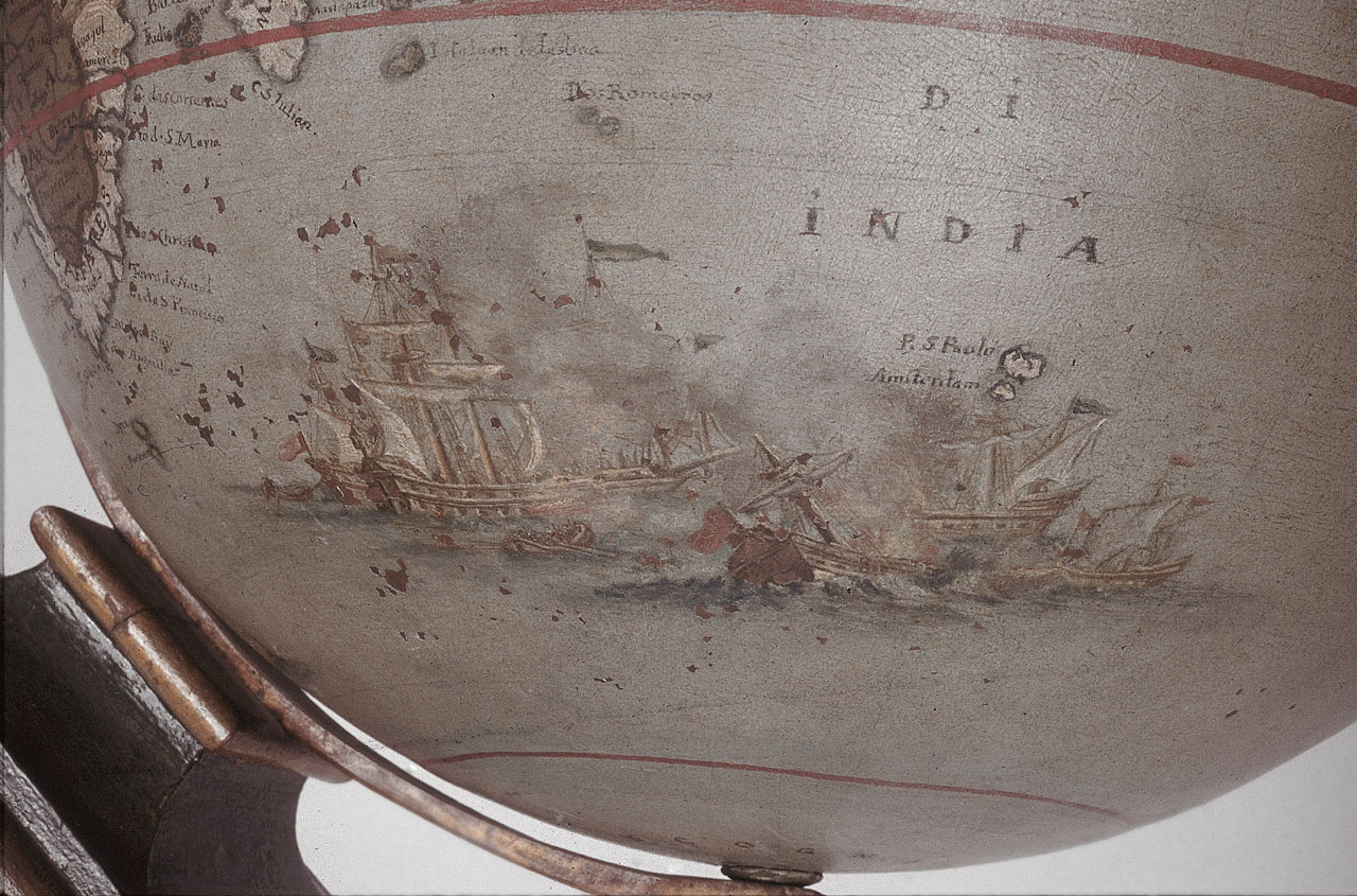 Terrestrial table globe. Terrestrial table globe. It forms a pair with the celestial globe, Blaeu GLB0151. Geographical details on the sphere include loxodromes for 32 compass points. The Strait of le Maire is drawn and the hypothetical southern continent