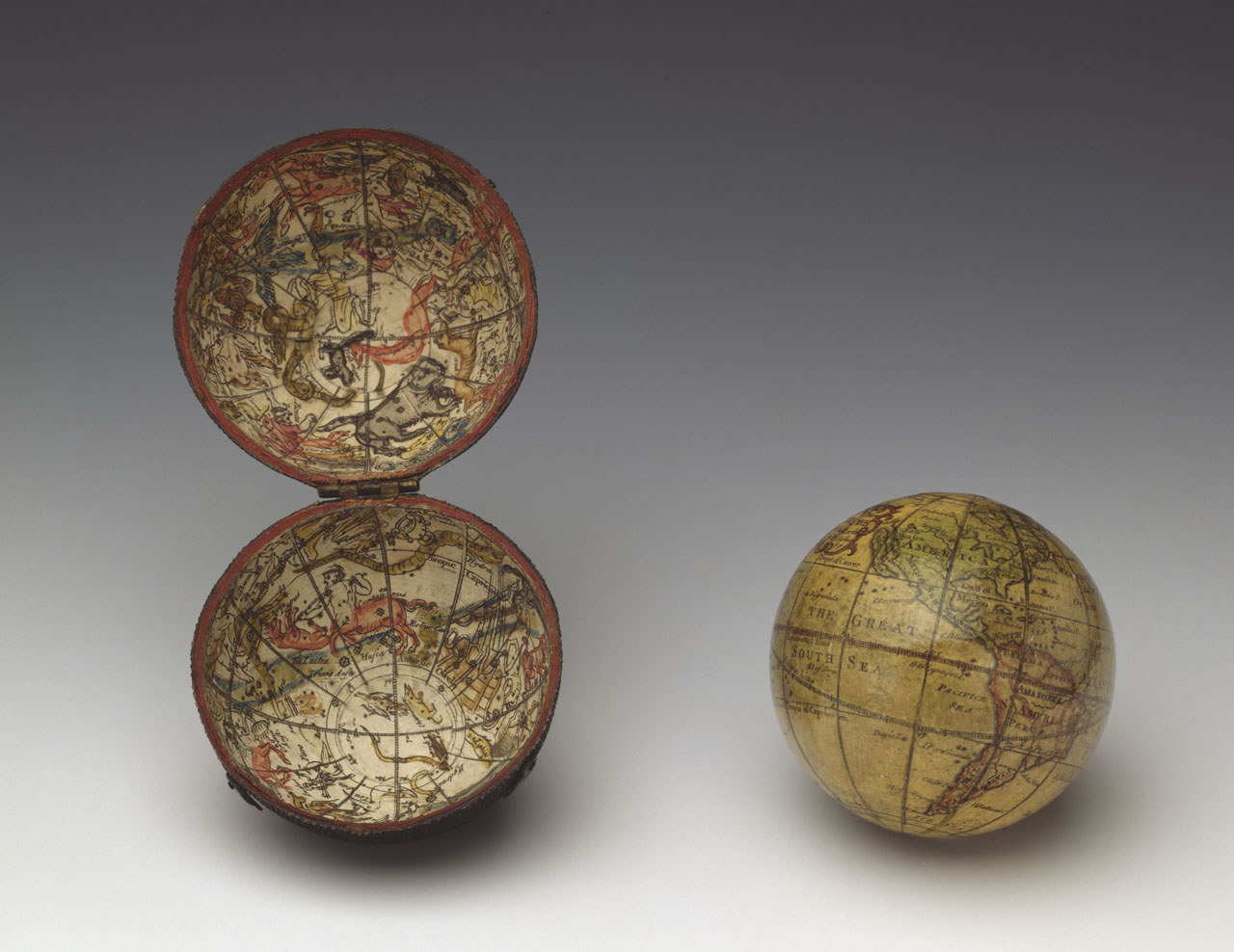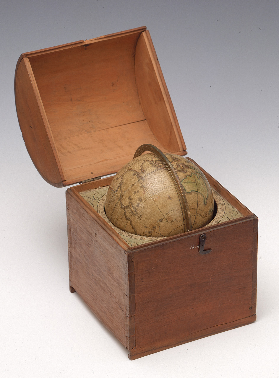Cary's pocket globe. This pocket globe consists of a terrestrial sphere contained within a spherical case, but departs from the usual convention of including a celestial sphere on the inside of the case. The sphere is made of papier mache and plaster