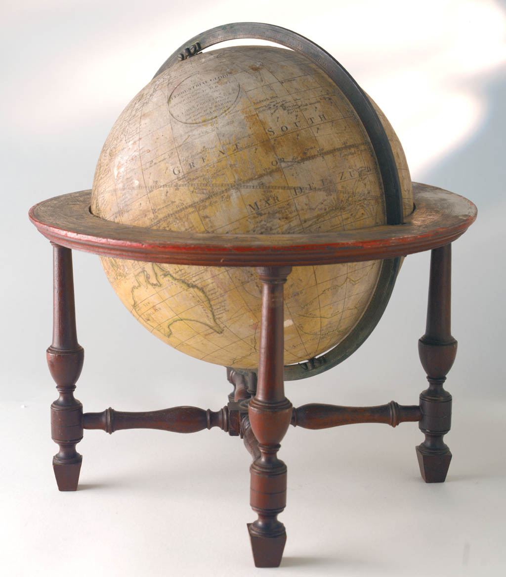 Terrestrial table globe. Terrestrial table globe. Geographical details on the sphere show California drawn as an island. The Dutch discoveries of Australia up to 1644 are shown, with names of capes in Dutch. The explorations of Dampier are not recorded. N