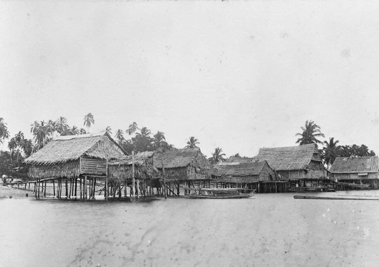 Indigenous houses built on stilts over the water at Zamboanga, Mindanao. A view across the water to the indigenous houses built on stilts in the water just off the beach at Zamboanga, Mindanao Islands, Philippines. In the forground is a local boat with o