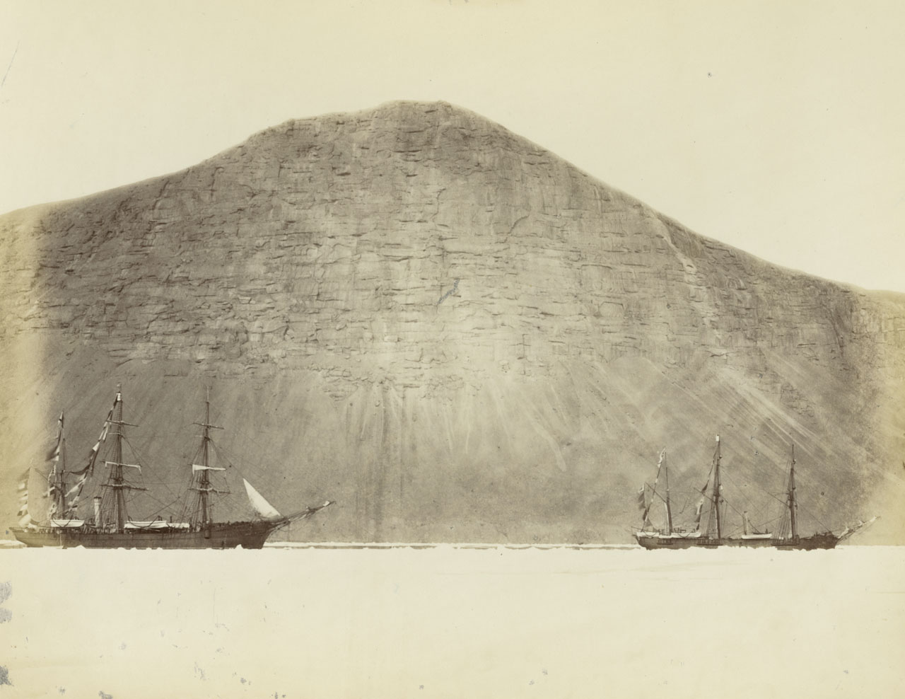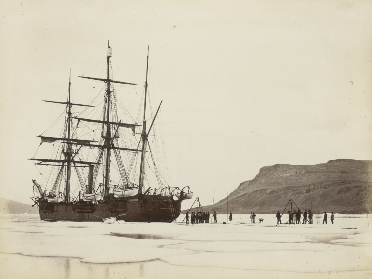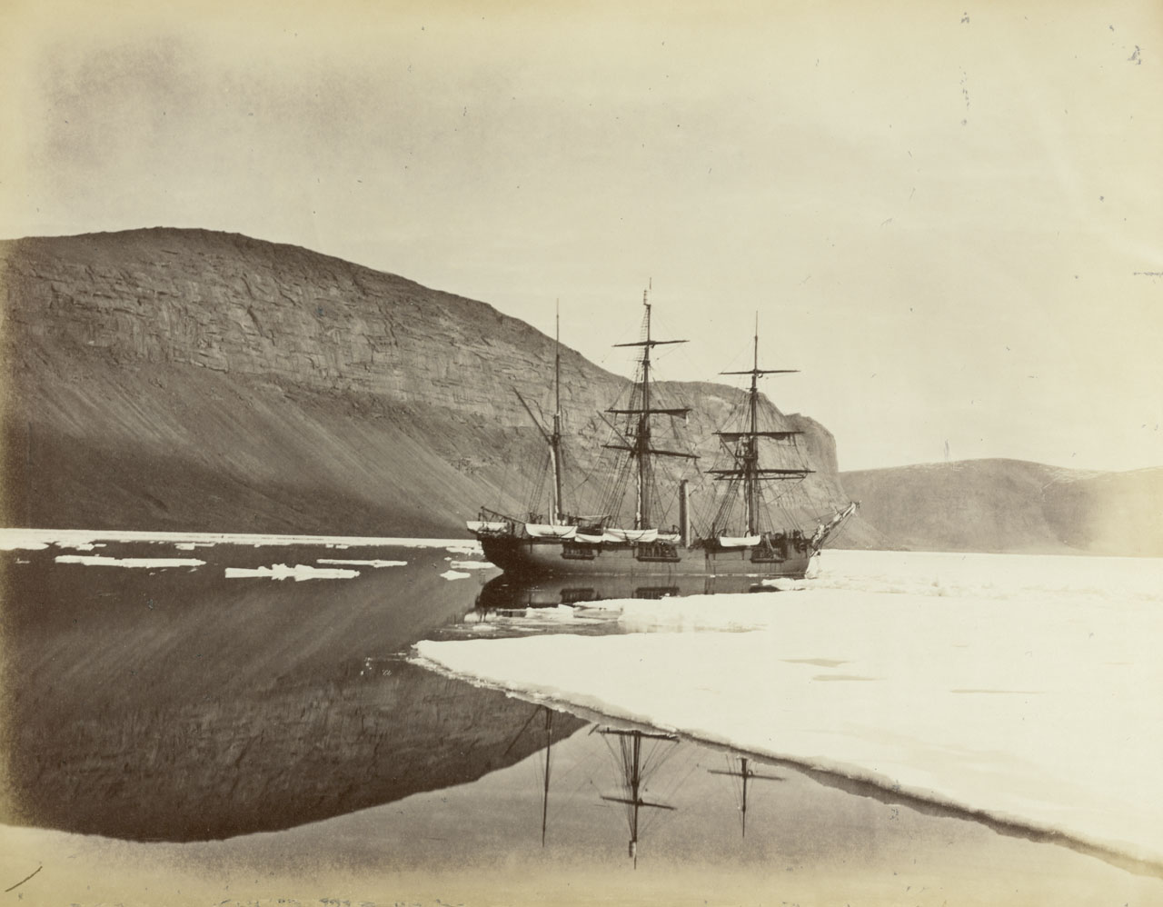 Fast to the floe under Cape Prescott, Franklin Pierce Bay. ‘Discovery’ (left) and ‘Alert’ (right) secured to the ice below Cape Prescott. This gave the crews of the two ships time to explore and exercise the dogs with the sledges.