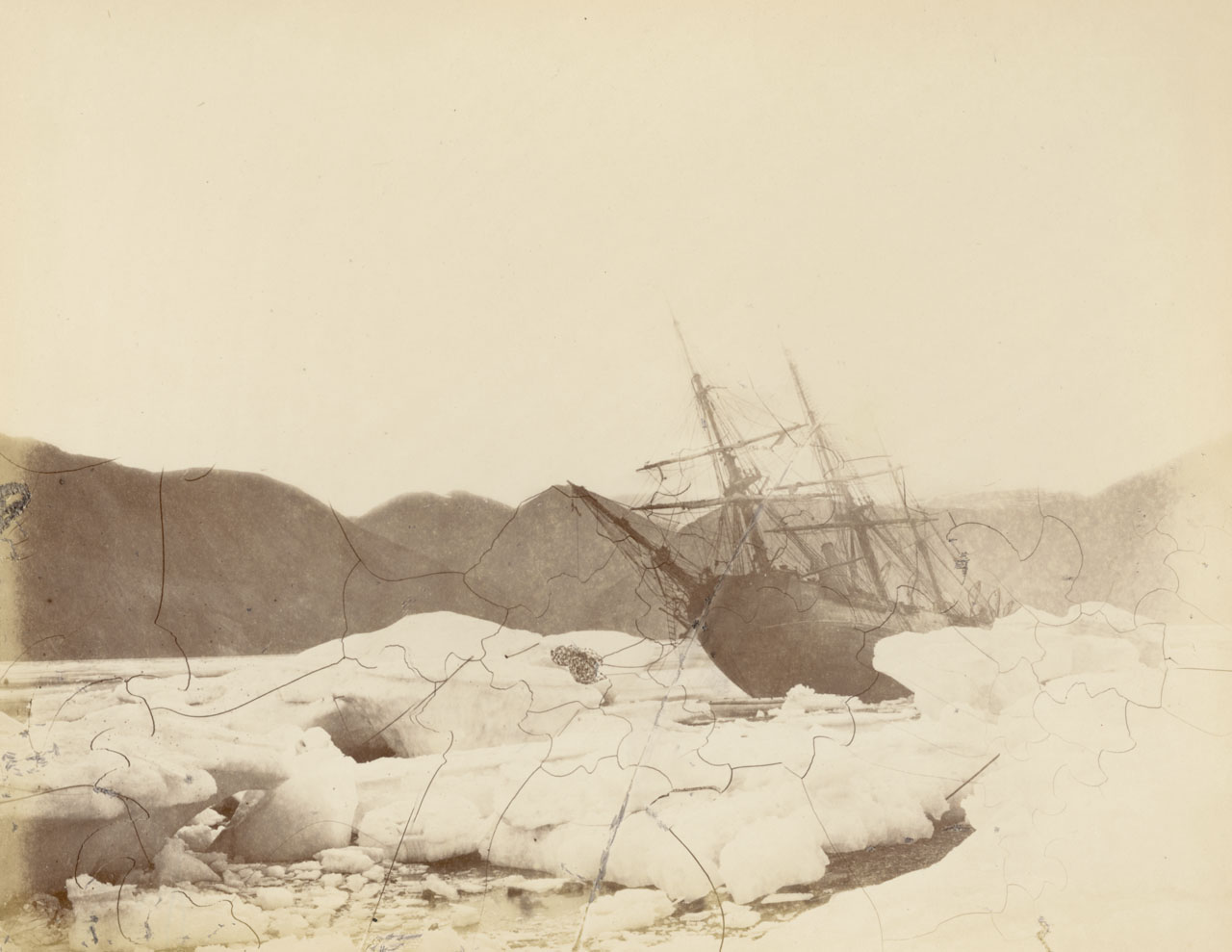 Newly formed floe-bergs, showing the old line of floatation. The official report stated that ‘the floe-bergs, at their maximum sizes, were pressed high up one over the other against the steep shore; the chaos outside was something indescribable, and