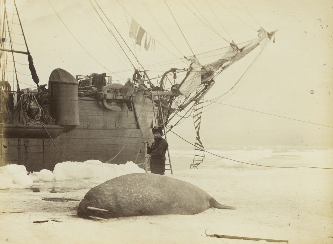 Starboard bow view of 'Alert' (1856), with Berrie, Ice Quartermaster, standing in the foreground behind a walrus which he killed.. On 10 August 1875, Parr wrote: ‘In the afternoon, one of our whaleboats went away to see if they could pick