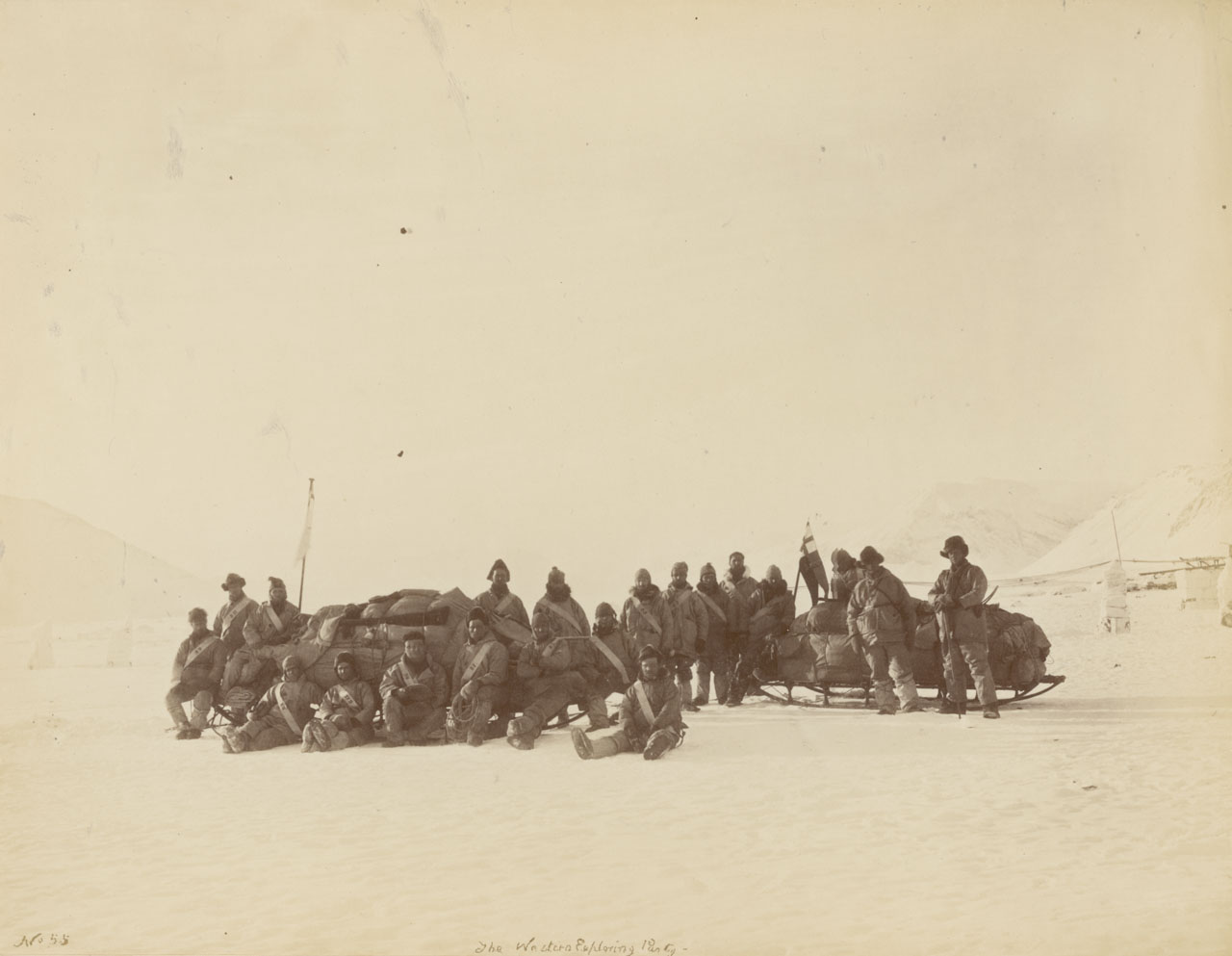 The Lady Franklin Sound Sledge Party prior to departure from Discovery.. Lt. Robert Archer of Discovery led the 12-man sledge Westward Ho to determine the continuity of Grant Land, as well as deciding whether Lady Franklin Strait is a bay, fiord or channe