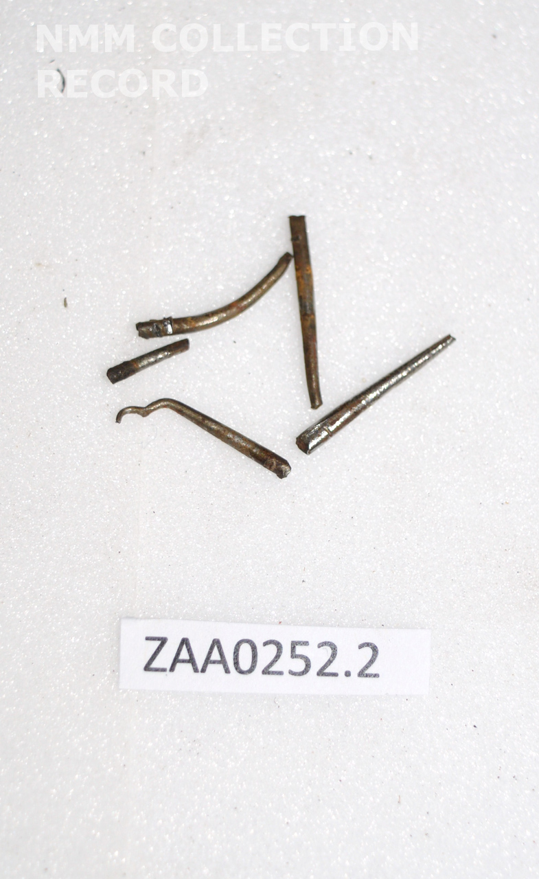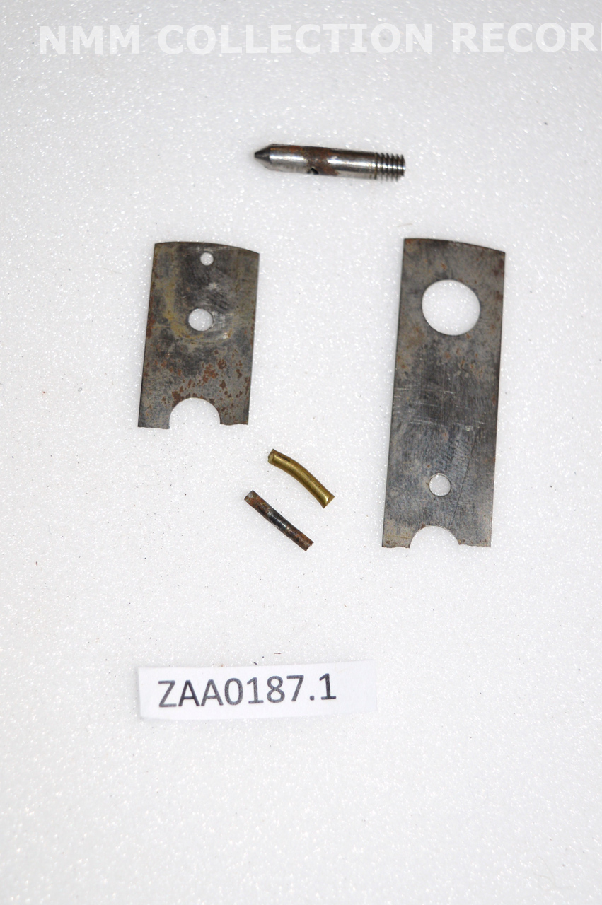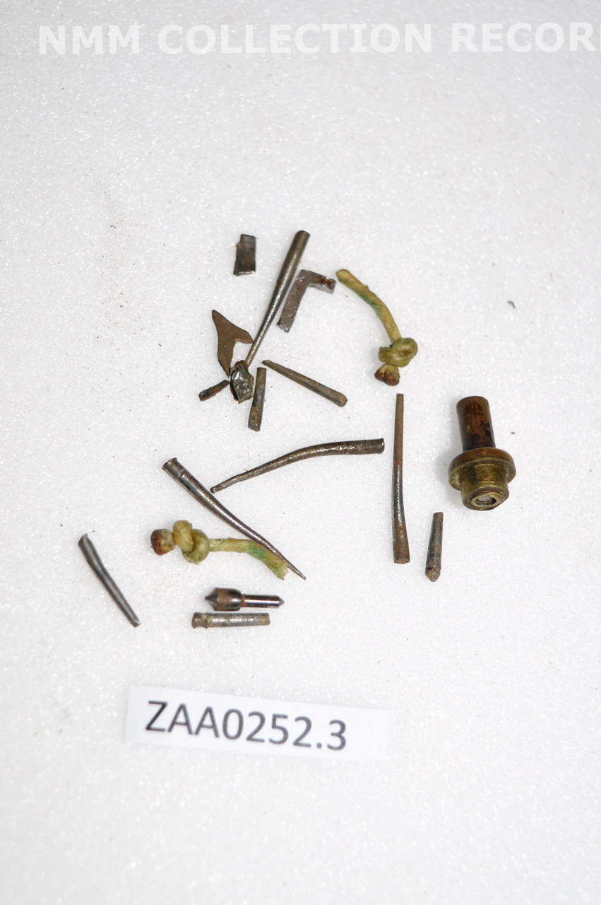 . Remains of various screws and a brass plate (contained in a plastic bag) from the bezel associated with ZAA0533 Shepherd's clock.