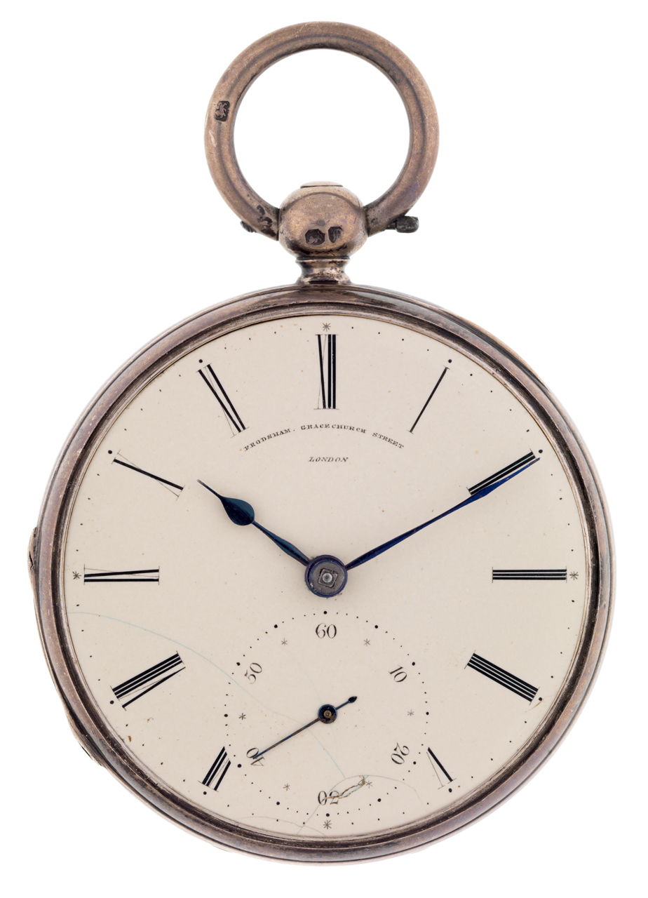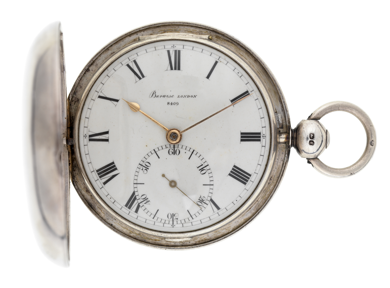 8409. Pocket watch in a hallmarked silver full-hunter case. It has a full-plate capped fusee movement, signed and numbered, with a duplex escapement and flat-rim plain balance. The watch has a white enamel dial with Roman numerals, subsidiary seconds dial
