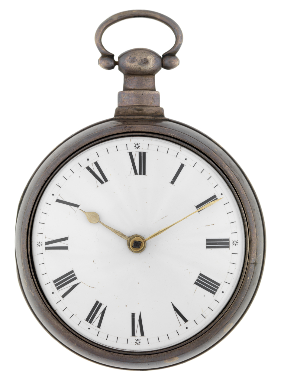 2517. Pocket watch in a hallmarked silver pair-case. It has a full-plate fusee movement, with a verge escapement and plain balance. The watch has a white enamel dial with Roman numerals and spade and poker hands (most of minute hand is broken off and miss