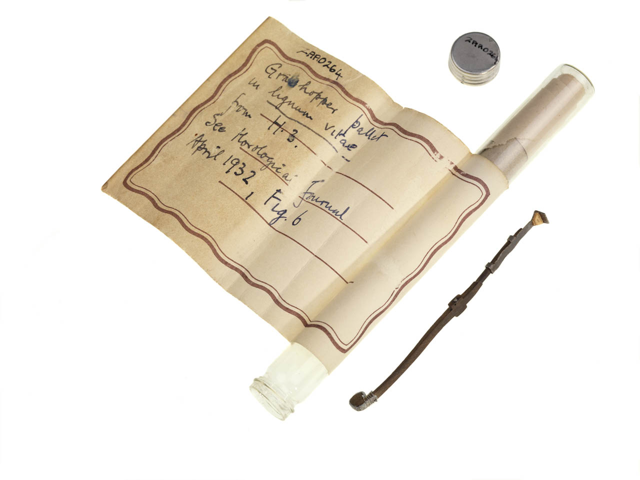 Grasshopper pallet. Glass tube containing one of H3’s original oak pallets. The pallet nib end is missing and the pallet now has an experimental metal (zinc?) nib, made by Gould, clamped to it, as well as a small lead counterweight bound to the pall