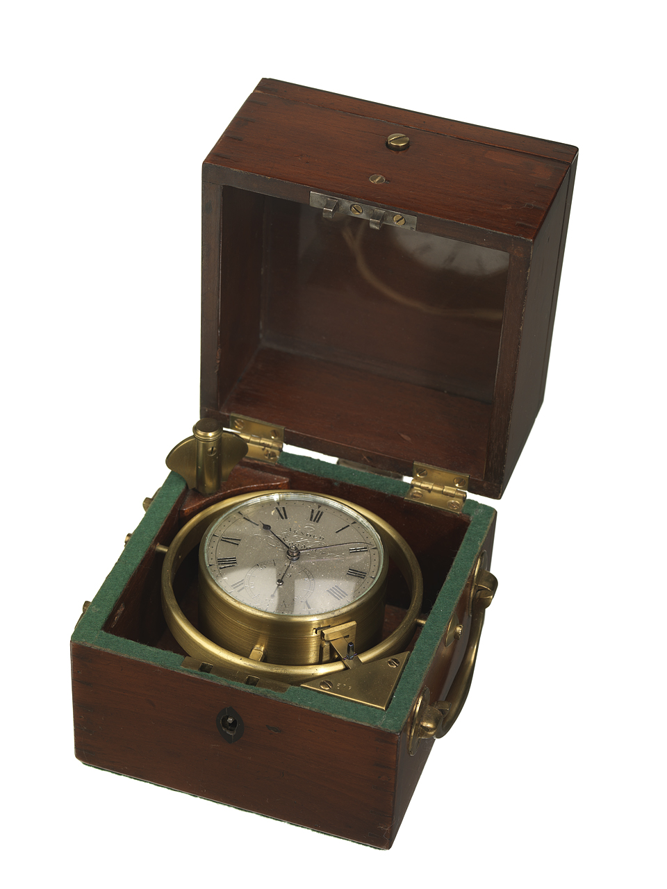 427. Marine chronometer movement now mounted vertically in a box with carrying handle. Made in 1796, this chronometer, serial number 427, was used in the Royal Navy until 1830. It was subsequently transferred from the Admiralty to the Royal Observatory Gr
