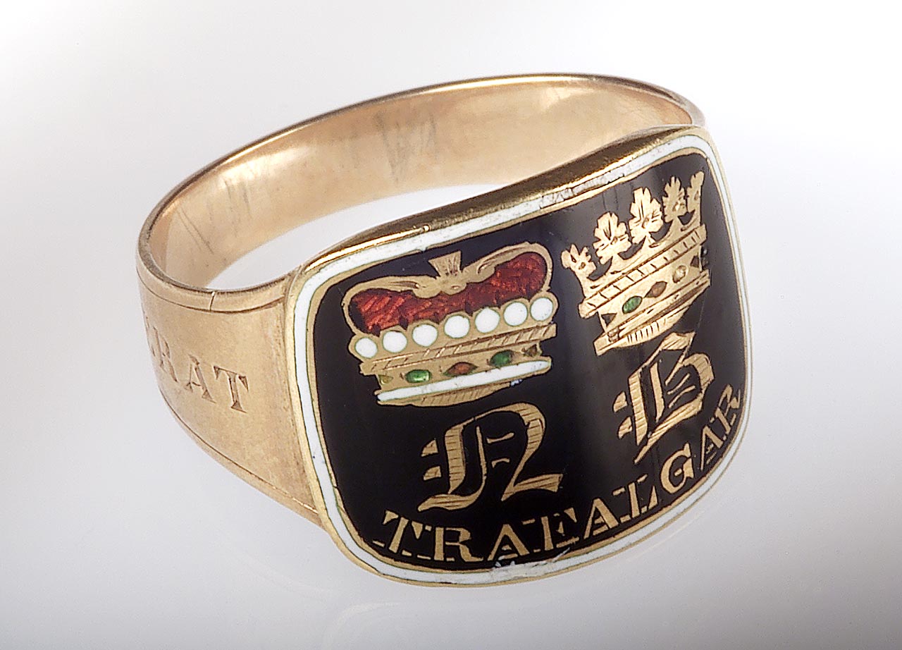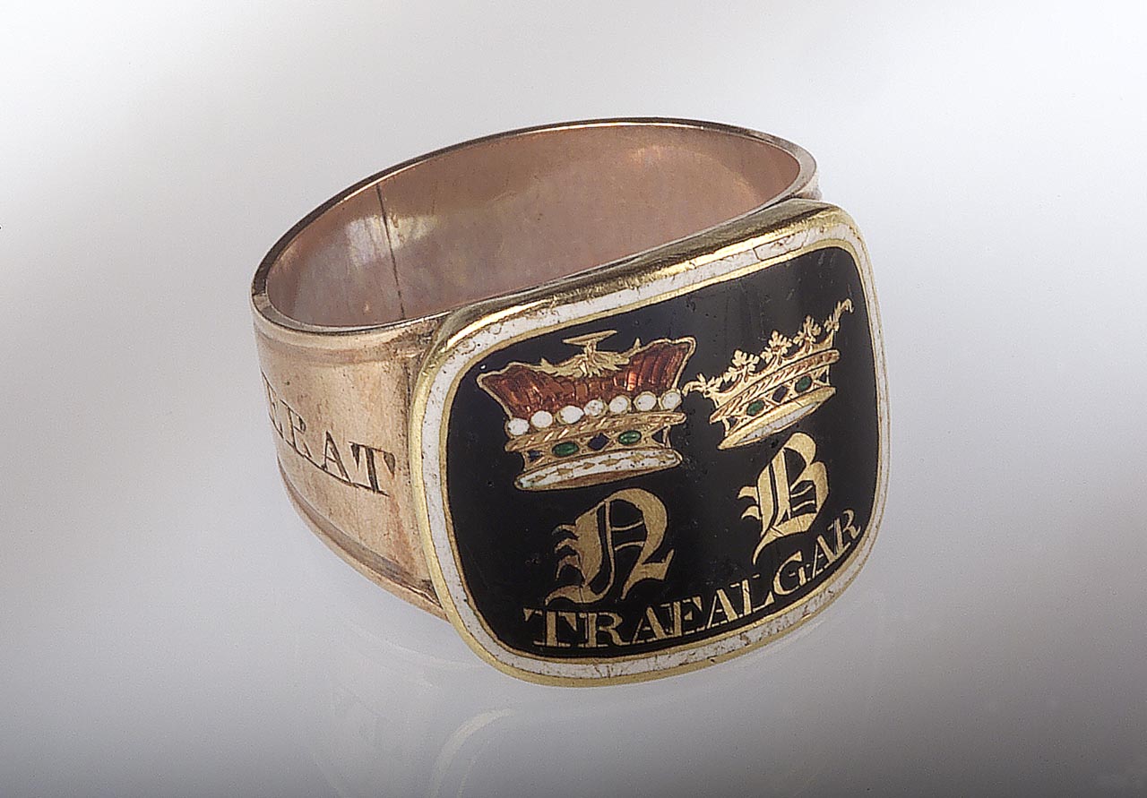 . Gold mourning ring commemorating Vice-Admiral Horatio Nelson (1758-1805). The bezel of the ring is decorated in red and white enamel with the letters 'N' and 'B', below two coronets and the name 'TRAFALGAR' executed on a bl
