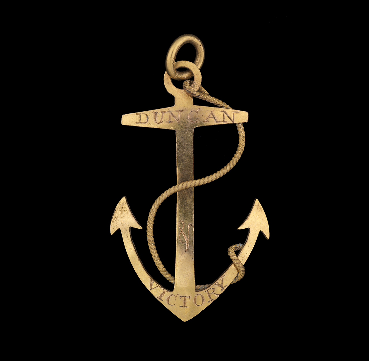 Badge commemorating the Battle of Camperdown and Admiral of the Fleet, Adam Duncan (1731-1804). Badge commemorating the Battle of Camperdown, 1797 and Admiral of the Fleet, Adam Duncan (1731-1804). A uniface badge in the form of a foul anchor. Inscriptio