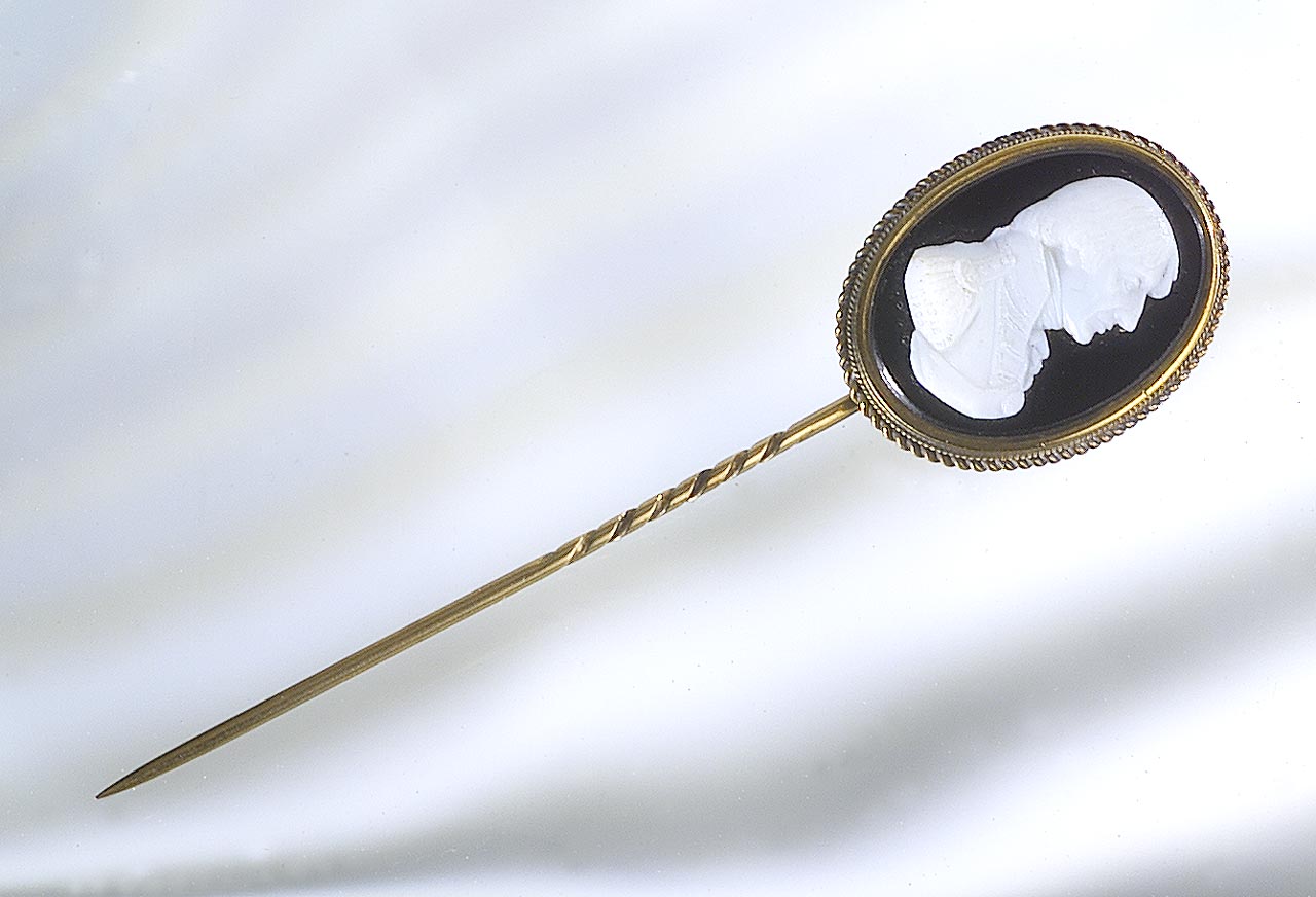. Oval black glass cameo mounted on the head of a metal scarf pin. The scarf pin has a partly twisted stem, while the cameo has a setting in the form of a twisted rope border. The cameo is decorated with a profile portrait depicting Vice-Admiral Horatio N