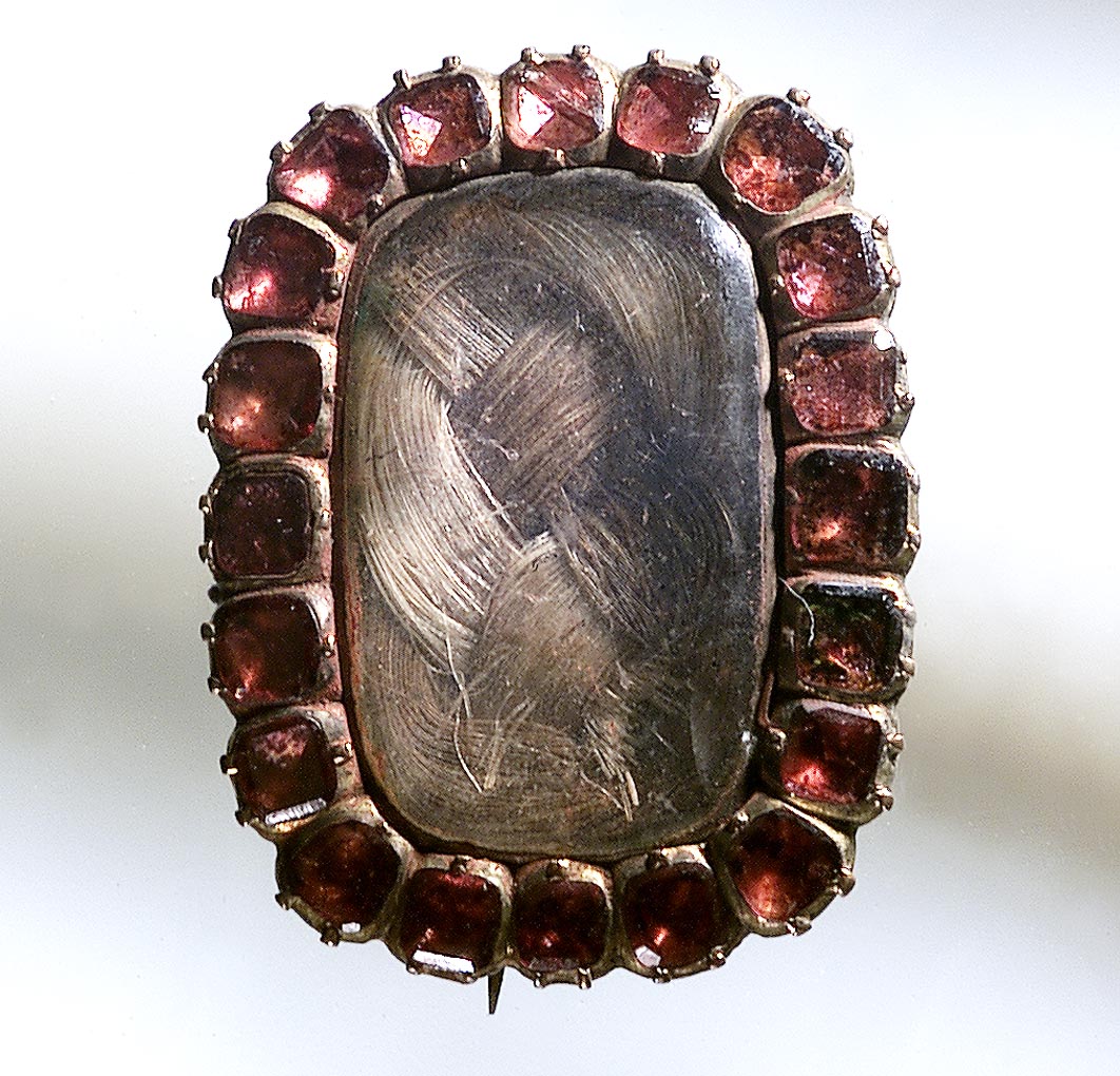 . Small rectangular gold brooch, fitted with a small suspension ring. A lock of plaited hair is contained within the centre of the brooch and is surrounded by a border of pink paste. The back of the brooch is inscribed 'E.L.H. from H.N. 1801'.