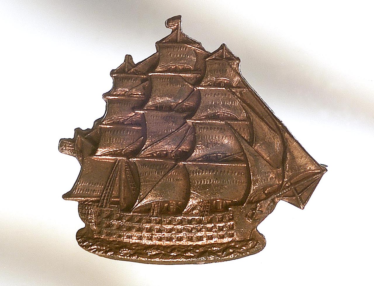 . Copper brooch made in the shape of 'HMS Victory'. The back of the brooch is engraved with the words 'CENTENARY MEMENTO OF THE DEATH OF NELSON 1805, OCT 21ST 1905. CONTAINING COPPER FROM H.M.S. VICTORY THE GIFT OF THE LORDS OF THE ADMIRALT