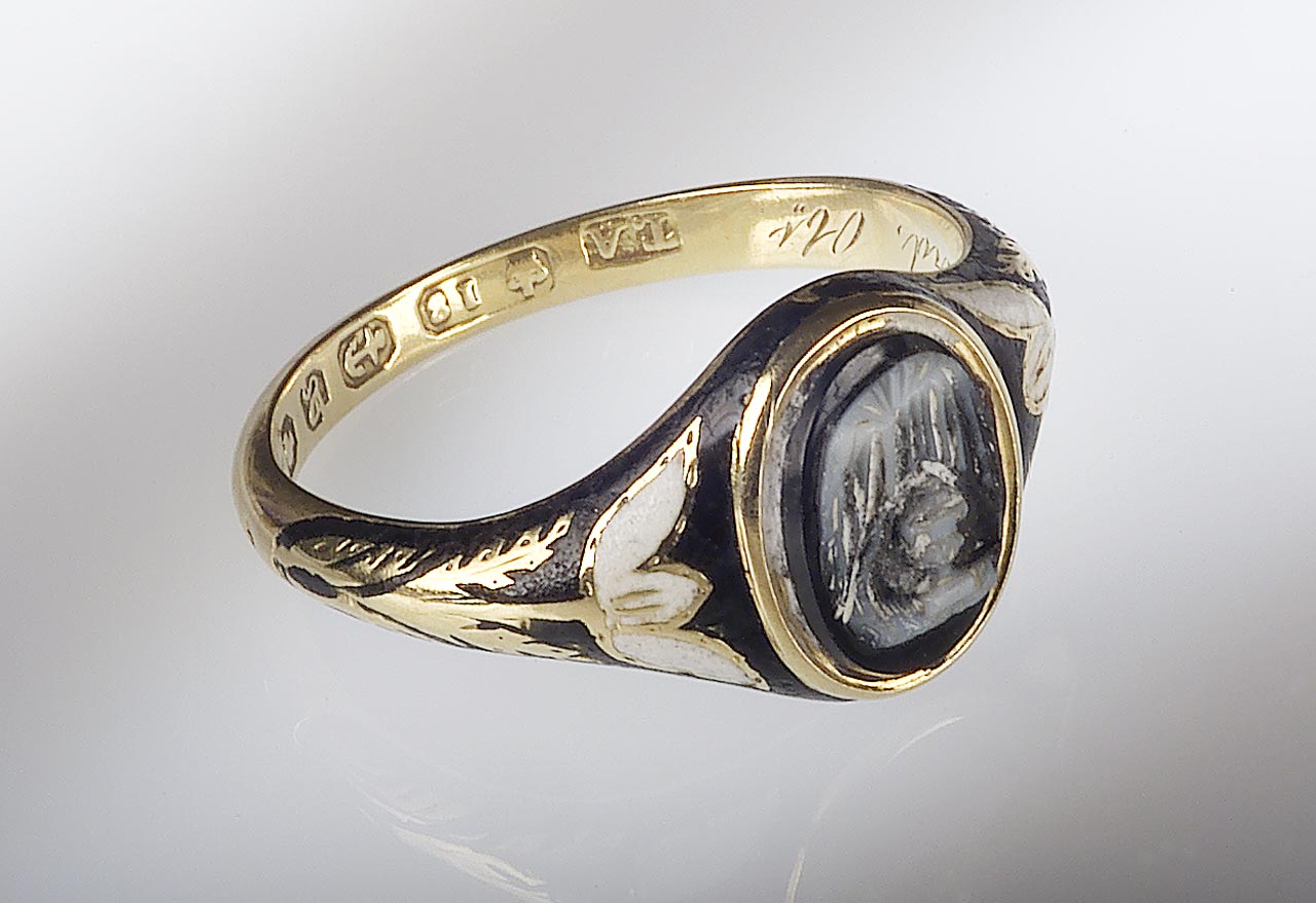 . 18ct gold mourning ring commemorating Maria Ward (died 1850). The bezel of the ring is set with a cameo which is decorated with a depiction of an urn beneath a weeping willow tree. The back of the bezel contains a lock of plaited hair, which is set unde