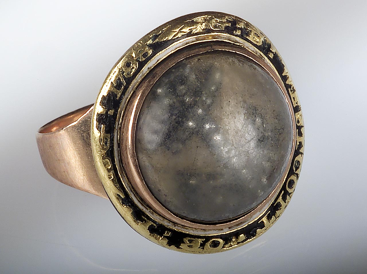 . Gold mourning ring commemorating James Ward. The bezel of the ring contains a lock of hair, which is set under a crystal and is surrounded with faceted black semi-precious stones, which are probably garnets. The hoop is decorated with black enamel with