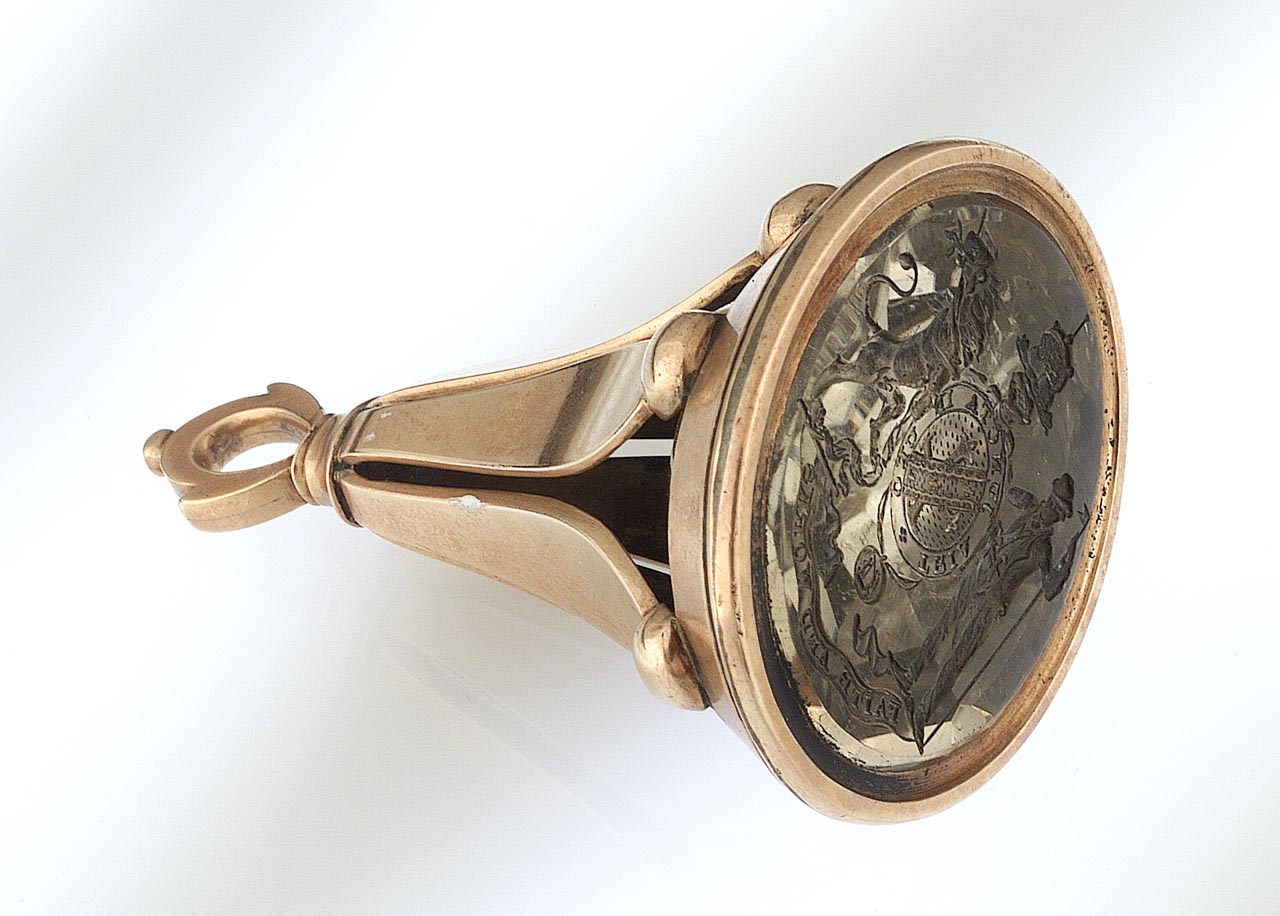. Gold fob seal set with a crystal intaglio. The intaglio is decorated with a depiction of the arms of Vice-Admiral Horatio Nelson (1758-1805) in use between 1797-1798. The seal is contained within a red leather jeweller's case.