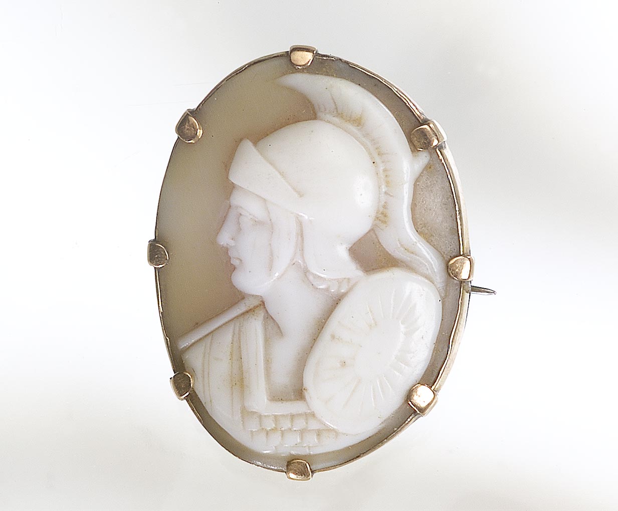 . Oval cameo contained within a gilt metal setting. The setting comes complete with a pin attachment at the back. The cameo depicts a figure wearing a helmet. Inscribed on the back of the brooch is the name and date 'Emma Hamilton 1797', which p