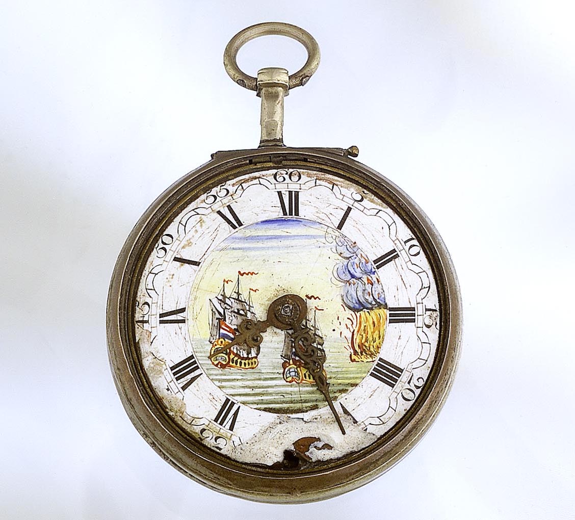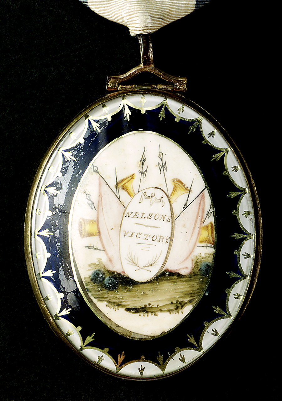 . The locket contains a painted ivory plaque depicting an oval shield, a trophy of arms and flags behind it, under glass with a blue- and gold-scalloped border. On the shield is the inscription: ‘NELSONS VICTORY’. A silver-gilt plaque on the b
