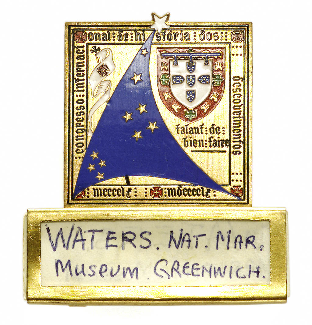 Lapel badge of the International Congress of the History of the Discoveries, Lisbon, 1960. Lapel badge of the International Congress of the History of the Discoveries, Lisbon, 1960. Square badge mounted on a rectangular base pierced for a member's na