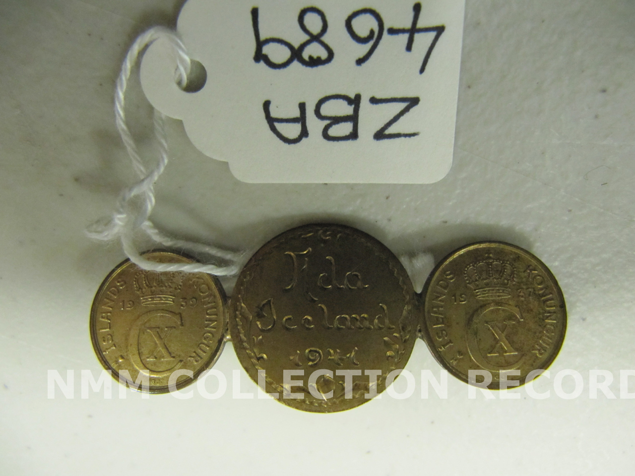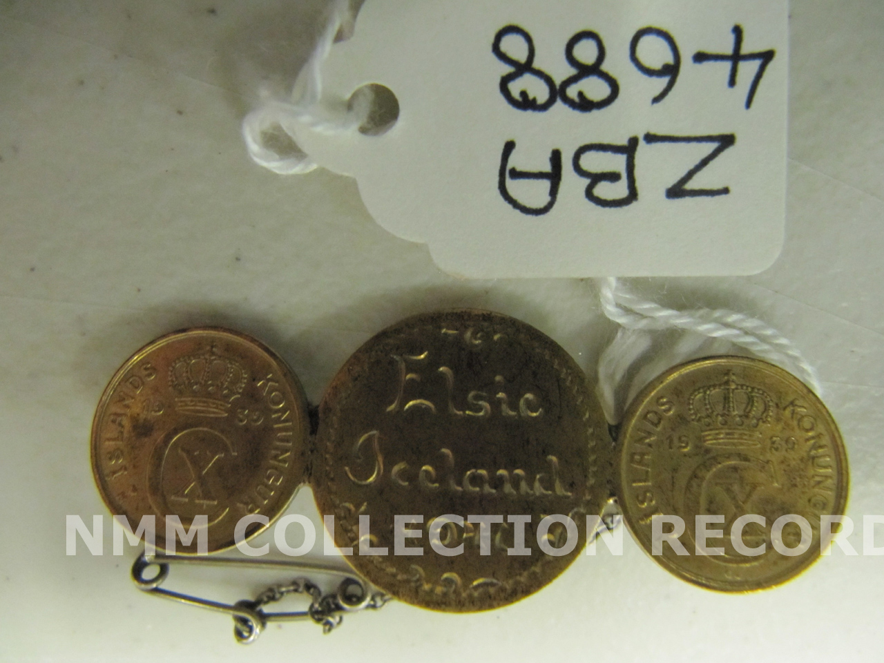 . Icelandic coins made into a brooch with a safety chain. Centre coin has the reverse smoothed and engraved ‘Elsie Iceland 1941’. Obverse: of coins on either side, ‘CX’ ‘ISLAND KONINGUR 1939.’ Reverse: ‘ISLAND EYR