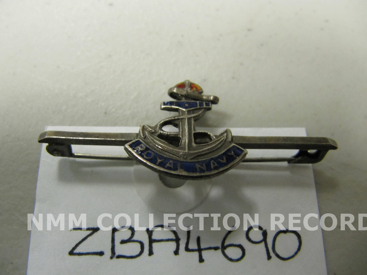 . Royal Navy tie-pin that has a foul anchor and above it is a King’s crown enamelled in red. On the blue enamelled ribbon below the anchor reads: ‘ROYAL NAVY’. The back of the pin is marked: ‘SILVER’.