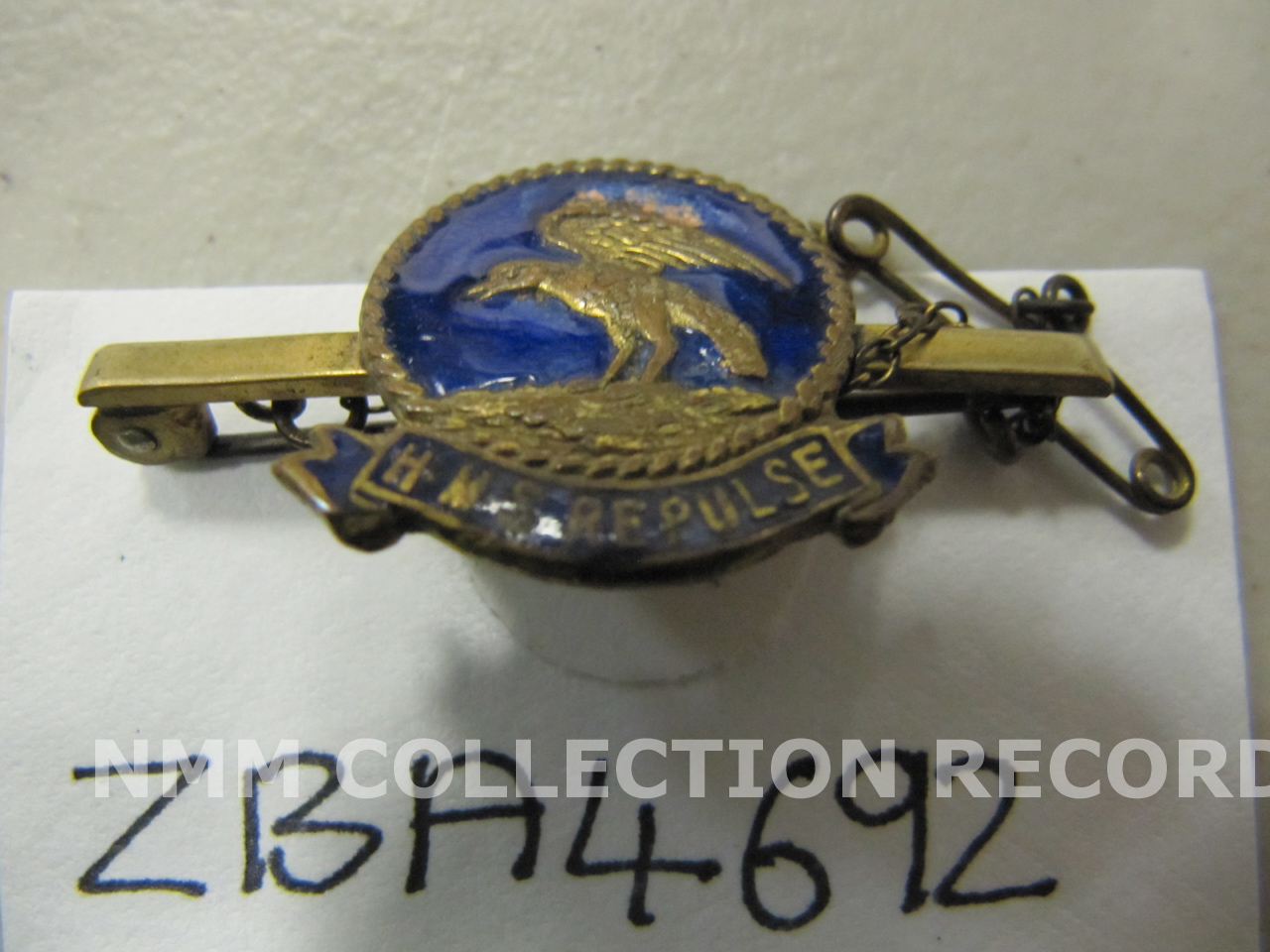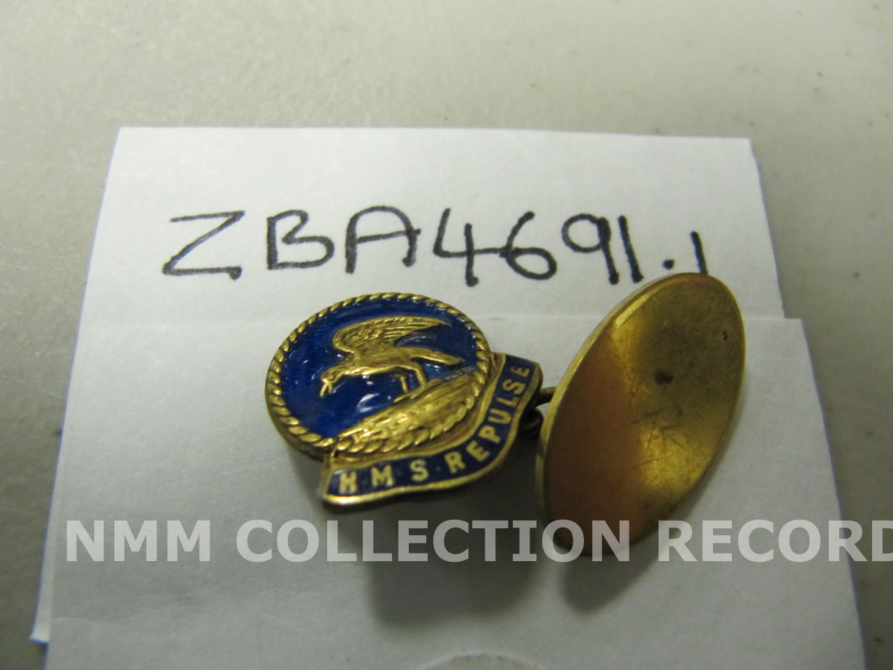. Cuff links, one broken. The complete one with enamelled ship’s badge, a gold eagle on a blue background. ‘HMS REPULSE’ on ribbon below. This badge was worn unofficially before being granted sealed pattern status just before the ship s