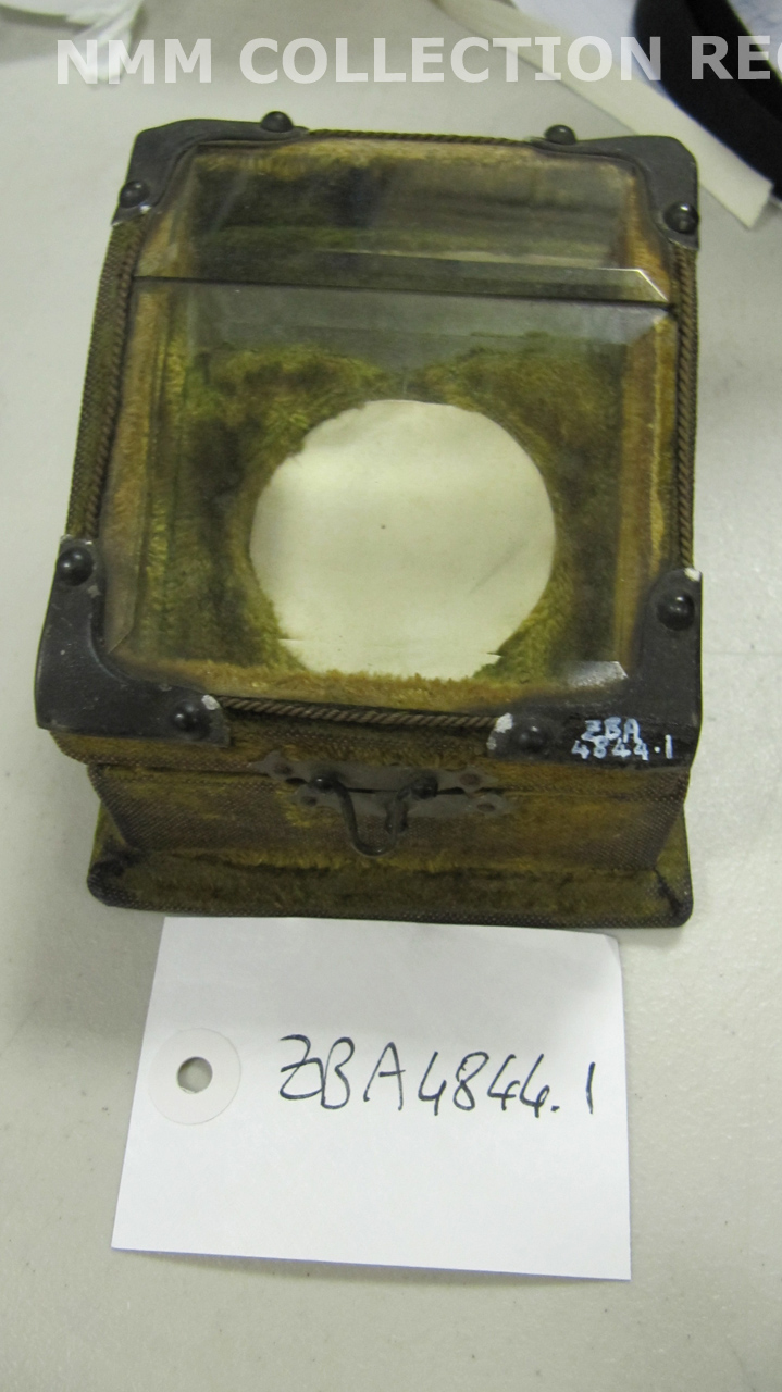 . Green velvet-covered presentation box with a glazed lid and back, designed to hold a medal and chain.