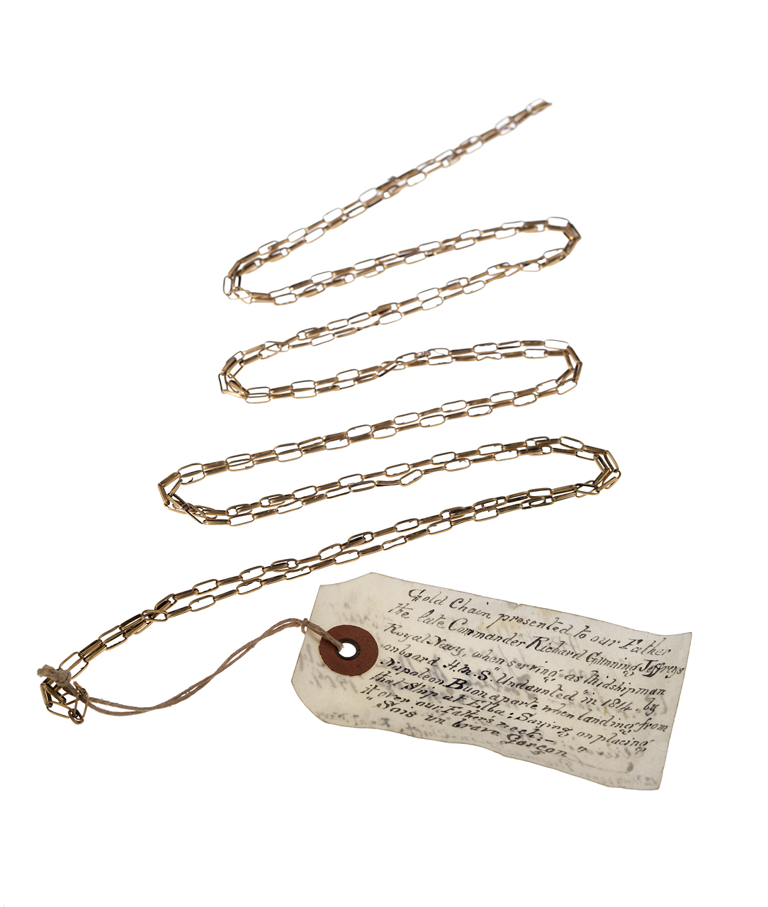 . Gold double-link chain, of the fetter type (with long flattened links). On an attached label: 'Gold Chain presented to our Father the late Commander Richard Gunning Jeffreys Royal Navy, when serving as Midshipman on board H.M.S. "Undaunted&quo