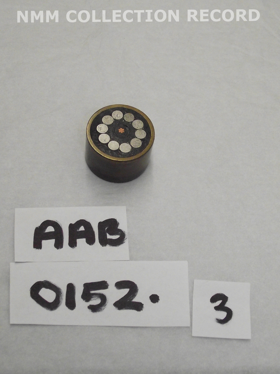 Submarine cable section. A section of deep-sea cable. It is cylindrical with a brass mount. The stranded copper wire surrounded by outer sheathing, a single covering of canvas tape followed by a coat of Bright and Clark's compound, then a single cove
